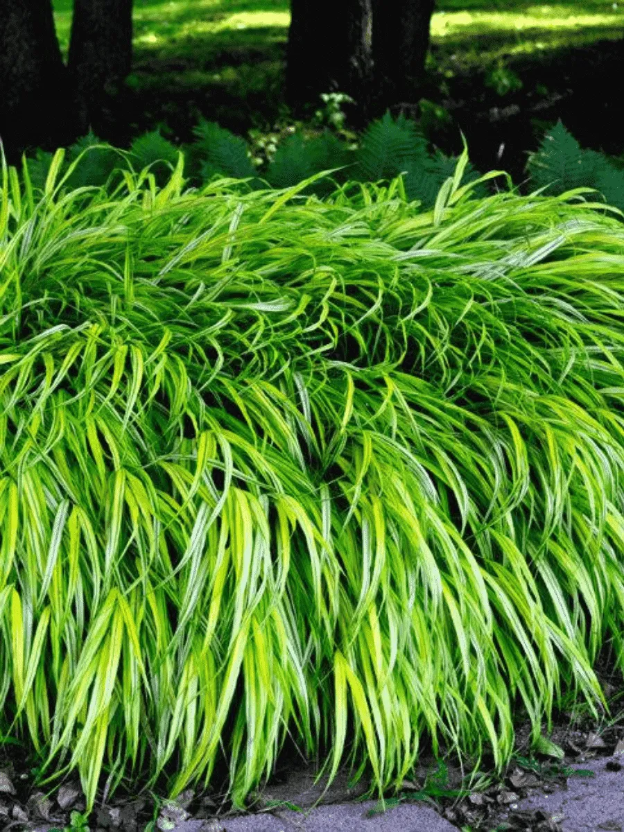 Хаконехлоа большая (Hakonechloa macra), элегантная представительница семейства злаковых родом из Японии, пленяет взор своей живописной формой и нежностью окраски. Это многолетнее травянистое растение образует пышную куртинку высотой до полуметра, состоящую из тонких, слегка извилистых стеблей, покрытых узкими листьями длиной около 15–20 см. Листья имеют характерную дугообразную форму, словно струящиеся ленты, плавно ниспадающие каскадом от основания куста. Их изумрудно-зелёная поверхность летом постепенно приобретает золотисто-жёлтые оттенки осенью, создавая эффект переливающейся волны. Цветёт хаконехлоа мелкими невзрачными колосками, собранными в рыхлые метельчатые соцветия, едва заметные среди роскоши листвы. Растение предпочитает полутень и влажные плодородные почвы, прекрасно адаптируясь к умеренному климату и украшая тенистые уголки садов изысканным восточным шармом.
