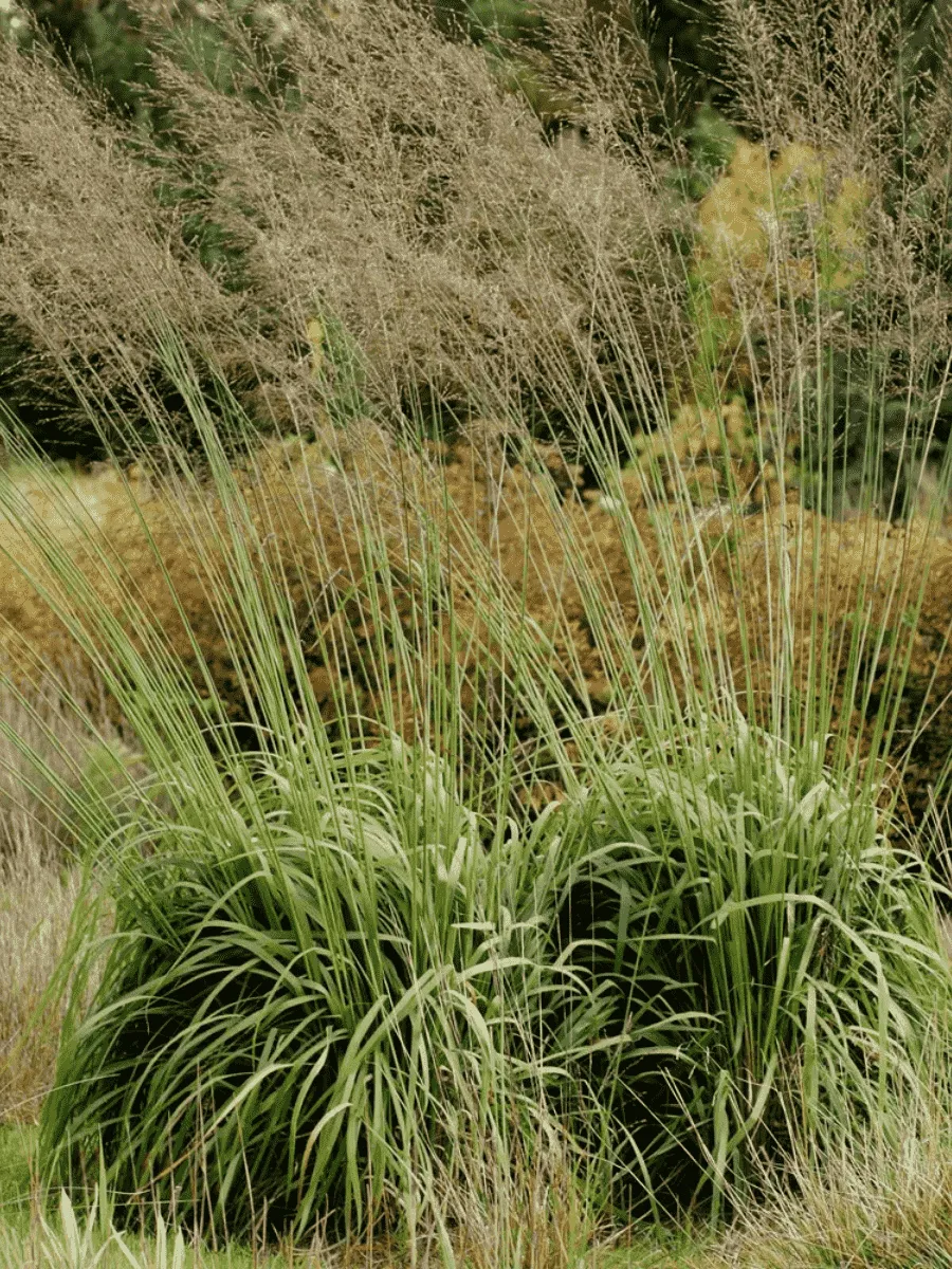 Молиния тростниковая Fontane (Molinia caerulea subsp. arundinacea) — элегантная многолетняя трава семейства Злаки, покоряющая своей утончённой красотой и благородством облика. Стройные стебли высотой до двух метров устремляются вверх подобно тонким стрелам, создавая воздушную композицию среди ландшафта. Листья узколинейной формы, длинные и гибкие, окрашены в нежнейшие оттенки зелёного цвета, плавно переходящие в золотисто-жёлтые тона осенью, когда растение словно одевается в роскошь осеннего солнца. Цветёт молиния мелкими, собранными в пышные метельчатые соцветия цветами, придающими ей особую лёгкость и очарование. Эти воздушные кисти колышутся над травостоем, наполняя пространство мягким шёпотом ветра и игрой света. Растение предпочитает влажные почвы и полутень, распространено преимущественно в умеренных зонах Европы и Азии, где оно украшает берега водоёмов, лесные поляны и сырые луга, придавая природному пейзажу изысканность и гармонию.