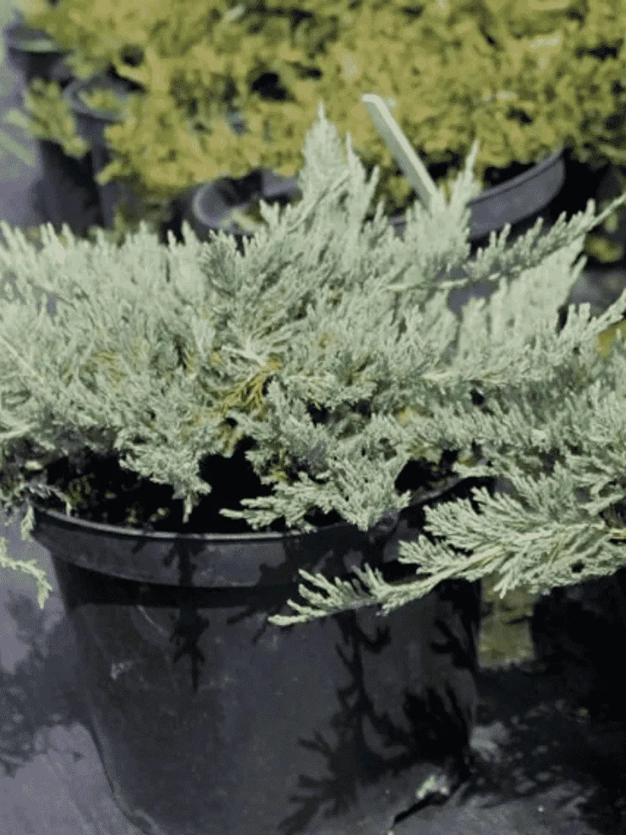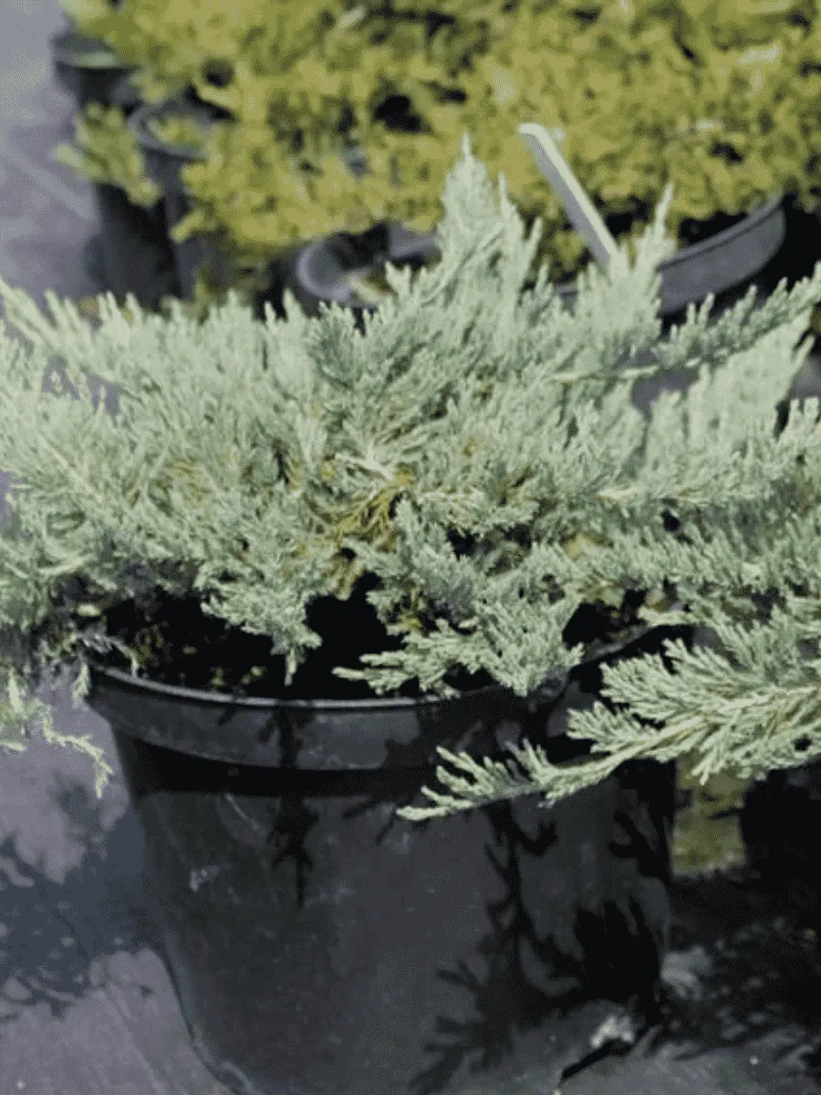 Можжевельник горизонтальный *Blue Forest* представляет собой живописную стелющуюся хвойную породу, отличающуюся элегантной формой кроны и изысканным голубовато-зелёным оттенком хвои. Его ветви раскинуты широко и равномерно, словно нежная кружевная манжета, плавно спускающаяся каскадом от центра куста к периферии. Игловидные листья мягкие, тонкие, слегка загнутые вверх, создавая впечатление пушистого ковра, переливающегося серебристым блеском даже в пасмурную погоду. Растёт медленно, ежегодно прибавляя всего несколько сантиметров, постепенно формируя плотную, густую крону, идеально подходящую для украшения каменистых садов, альпийских горок и рокариев. Цветение практически незаметно, поскольку мелкие невзрачные шишкоягоды скрыты среди густой зелени ветвей, уступая первенство декоративности самой хвое. Благодаря своей неприхотливости и устойчивости к неблагоприятным условиям среды, можжевельник *Blue Forest* уверенно чувствует себя на открытых солнечных участках, демонстрируя свою природную красоту долгие годы.