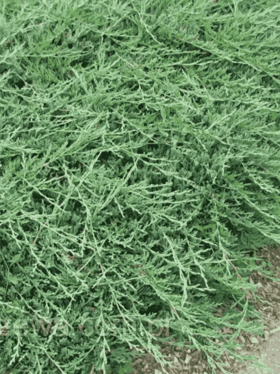 Можжевельник горизонтальный *Jade River* представляет собой живописную стелющуюся хвойную породу, отличающуюся элегантной формой и изысканной расцветкой. Его густые ветви раскинуты веером, словно нежная зелёная рябь реки, плавно струящейся среди камней. Игловидные листья имеют насыщенный изумрудный оттенок, слегка отливающий голубизной, особенно заметной зимой, когда растение приобретает серебристо-зелёный тон. Цветение практически незаметно, поскольку крошечные шишкоягоды скрыты среди густой хвои и едва различимы глазу. Растёт медленно, постепенно разрастаясь в ширину, создавая плотный ковёр высотой до полуметра и шириной около двух метров. Предпочитает солнечные места, хорошо переносит засуху и морозы, легко адаптируется к различным типам почв, кроме заболоченных участков. Благодаря своей декоративности и неприхотливости широко используется в ландшафтном дизайне для украшения альпийских горок, рокариев и каменистых садов, где подчёркивает природную красоту окружающего пространства.