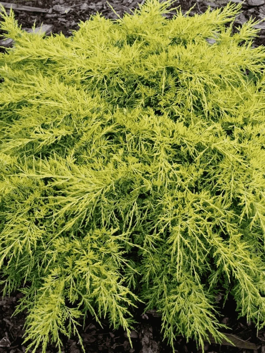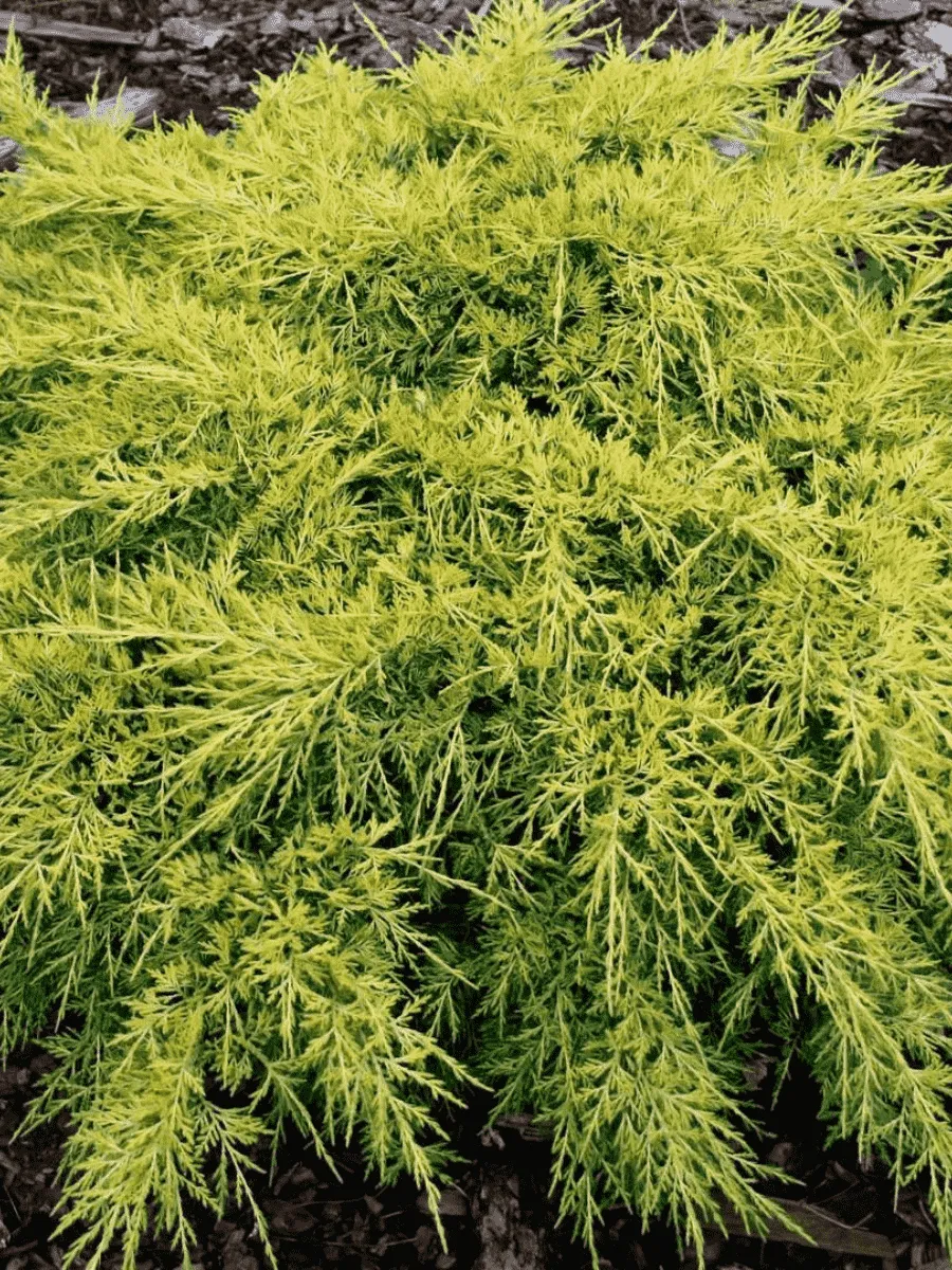 Можжевельник средний **King of Spring** представляет собой компактную вечнозелёную кустарниковую форму с густой пирамидальной кроной, достигающей высоты до полутора метров. Его густые ветви покрыты мелкими чешуевидными листьями насыщенного изумрудно-зелёного цвета, приобретающими весной нежнейший оттенок свежей зелени, словно отражающий первые лучи весеннего солнца после долгой зимы. Растёт медленно, ежегодно прибавляя всего несколько сантиметров, благодаря чему сохраняет свою аккуратность и декоративность долгие годы. Цветки практически незаметны среди пышной хвои, однако именно листья придают растению особую привлекательность и делают его незаменимым элементом ландшафтного дизайна, подчёркивая элегантность садов и парков своей строгой формой и благородством оттенков зелёного.