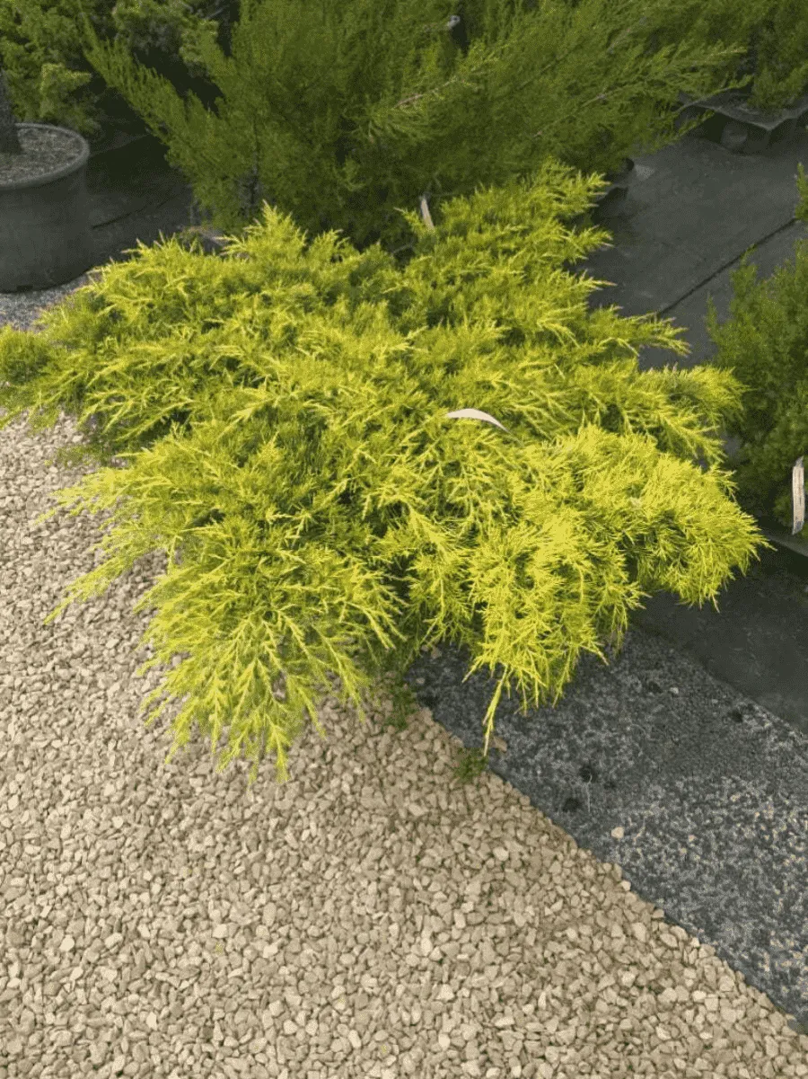 Можжевельник средний 'Mordigan Gold' представляет собой живописную вечнозелёную кустарниковую форму с компактной кроной, достигающей высоты до полутора метров и ширины около двух метров. Его густые ветви образуют плотную округлую шапку, украшенную мелкими игловидными листьями насыщенного золотисто-жёлтого цвета, особенно ярко проявляющегося весной и летом, когда солнечные лучи подчёркивают нежность и изысканность окраски. Осенью листья приобретают бронзовый оттенок, добавляя растению особую декоративность. Цветёт можжевельник скромно, практически незаметно, однако именно его листва становится главным украшением сада благодаря своей необычной расцветке и плотной структуре кроны. Растение отличается медленным ростом, устойчивостью к неблагоприятным условиям среды и неприхотливостью в уходе, прекрасно адаптируясь даже в суровых климатических зонах средней полосы России.