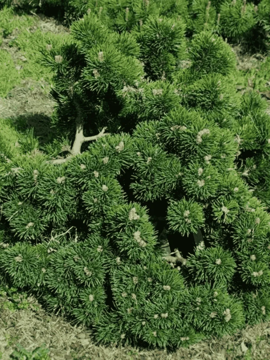 Сосна горная *Pinus mugo* Jakobsen — вечнозелёное хвойное дерево или кустарник, обладающее компактной кроной и медленным ростом, придающим ей особую декоративность. Стройные ветви густо покрыты короткими игловидными листьями тёмно-зелёного цвета, собранными попарно в пучки, словно миниатюрные зелёные кисти художника. Иглы сосны горной плотные, жёсткие, слегка блестящие, сохраняют свежесть круглый год, создавая живописную картину даже зимой среди снежных просторов. Цветёт растение мелкими жёлтыми мужскими шишечками и красноватыми женскими соцветиями, расположенными преимущественно на концах ветвей. Благодаря своей неприхотливости и устойчивости к суровым условиям произрастания, сосна горная широко распространена в горных районах Европы, где она украшает альпийские луга и склоны, придавая ландшафту особый колорит и очарование.