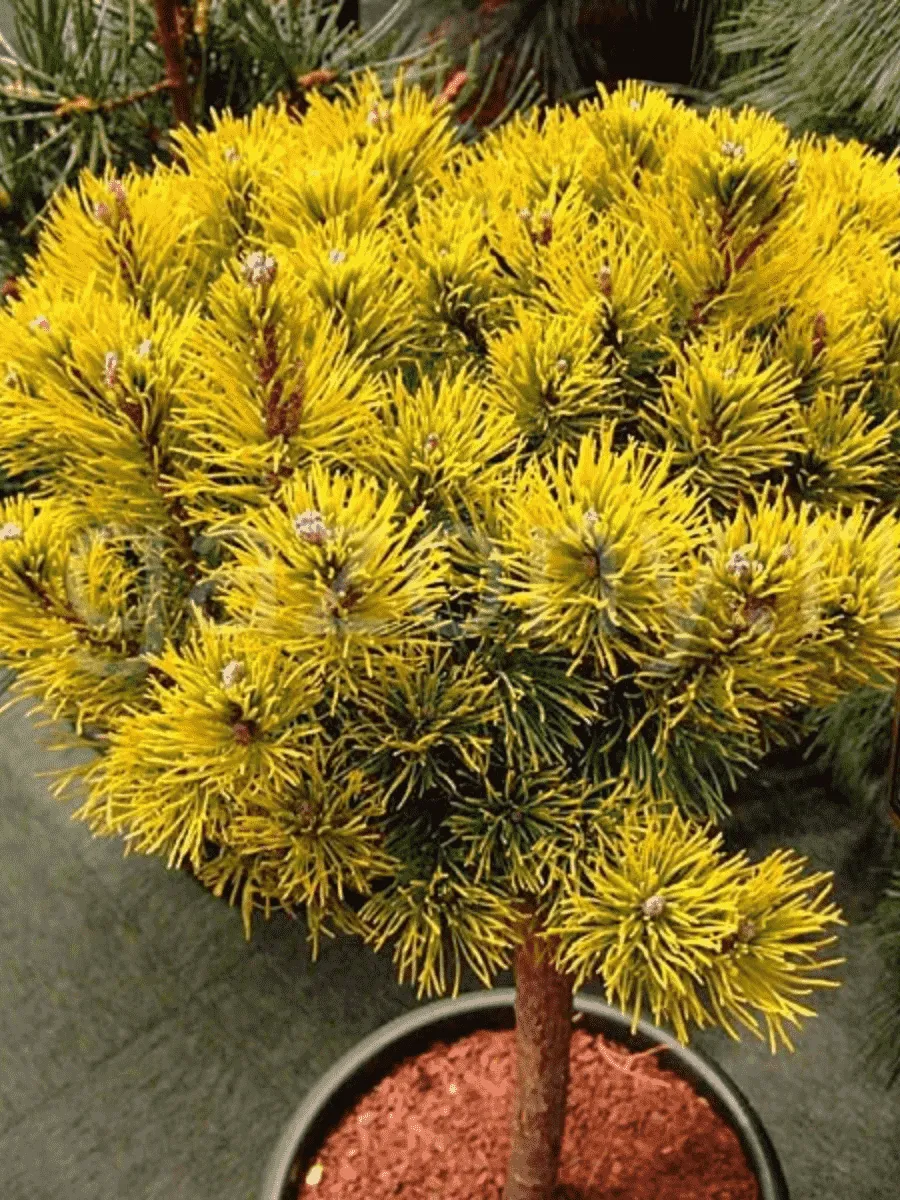 Сосна горная *Winter Gold* штамб представляет собой компактную декоративную разновидность сосны, отличающуюся элегантной формой кроны и необычной золотисто-жёлтой окраской хвои зимой и ранней весной. Это медленнорастущее дерево обладает густой пирамидальной кроной, состоящей из коротких иголок длиной около двух-трёх сантиметров, собранных в пучки по две штуки. Летом хвоя приобретает насыщенный зелёный оттенок, который осенью сменяется ярким лимонно-золотистым цветом, особенно заметным после первых морозов. Растёт преимущественно вертикально вверх, сохраняя стройность и аккуратность формы даже во взрослом состоянии. Благодаря своей неприхотливости и устойчивости к неблагоприятным условиям среды широко используется в ландшафтном дизайне для украшения садов и парков, где её нарядная внешность неизменно привлекает внимание ценителей красоты природы.