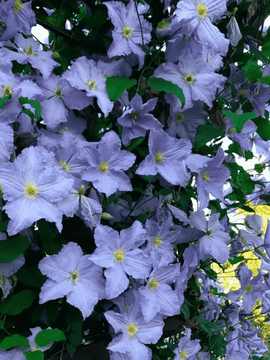 Клематис гибридный *Blekitny Aniol* пленяет взор нежностью небесной лазури своих крупных цветков, достигающих диаметра до 15 см, украшенных волнистыми лепестками, словно сотканными из утренней дымки. Листья растения перистые, рассечённые на несколько овальных листочков, покрытых тонким пушком, придающим им бархатистость и мягкость очертания. Цветоносы крепкие, поднимают соцветия высоко над листвой, позволяя каждому бутону раскрыться во всей красе. Период цветения продолжительный, начинается в июне и длится до конца августа, наполняя сад волшебством голубых оттенков. Растёт быстро, легко взбирается вверх по шпалерам и решёткам, достигая высоты около трёх метров, создавая живописную живую ширму или эффектный акцент среди зелёных насаждений.