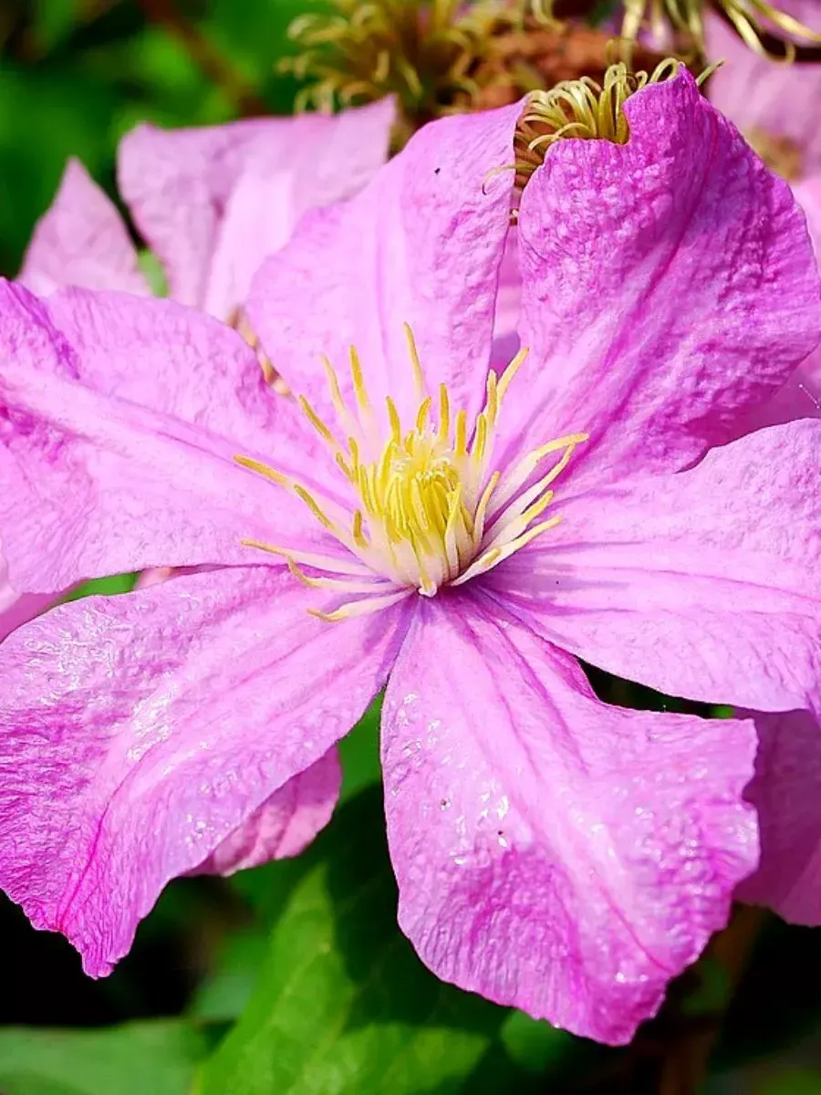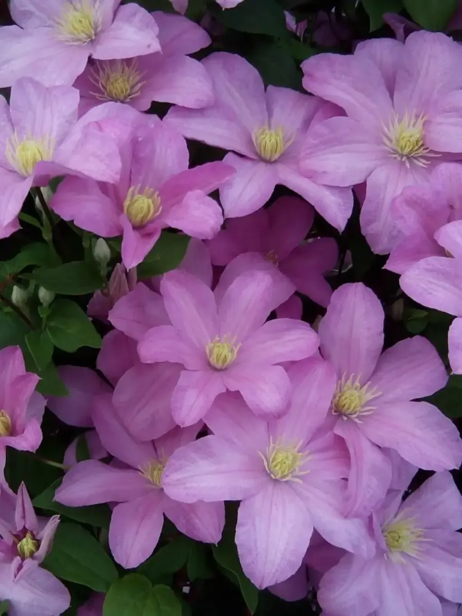 Клематис гибридный *Comtesse de Bouchaud* пленяет взор роскошью своего цветения и утончённостью форм. Это элегантная лиана с гибкими побегами, достигающая высоты до трёх метров, украшенная крупными сердцевидными листьями насыщенного зелёного цвета, придающими растению свежесть и благородство облика. Цветки крупные, диаметром около десяти сантиметров, обладают нежной бархатисто-розовой окраской с лёгким пурпурным оттенком, который особенно заметен в центре лепестков, создавая эффект градиента от светлого края к тёмному центру. Бутоны раскрываются постепенно, демонстрируя свою красоту в течение всего лета, начиная с июня и заканчивая сентябрём. Растёт быстро, легко цепляясь за опоры своими усиками, распространяя ароматную атмосферу вокруг себя и превращаясь в живописный элемент сада, достойный восхищённых взглядов.