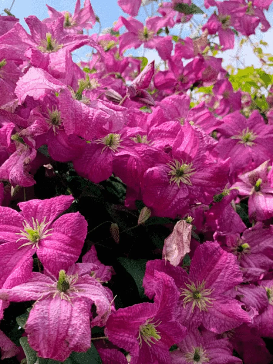 Клематис гибридный *Mazurek* пленяет взор роскошной зеленью крупных сердцевидных листьев, покрытых нежным бархатистым пушком, словно бережно укрытых утренней дымкой. Его побеги устремляются вверх мощными струящимися линиями, достигая высоты до трёх метров, создавая живописную живую завесу. Цветки раскрываются щедрым фейерверком ярких красок, поражают крупными размерами (до 15 см), формой элегантных чашечек и насыщенным пурпурно-фиолетовым оттенком лепестков, украшенных серебристо-белыми штрихами, будто кистью мастера нанесёнными лёгкими мазками. Бутоны появляются обильно, начиная с июня и вплоть до первых осенних заморозков, превращая растение в великолепный каскад цветов, привлекающий внимание своей изысканной красотой и утончённостью форм.