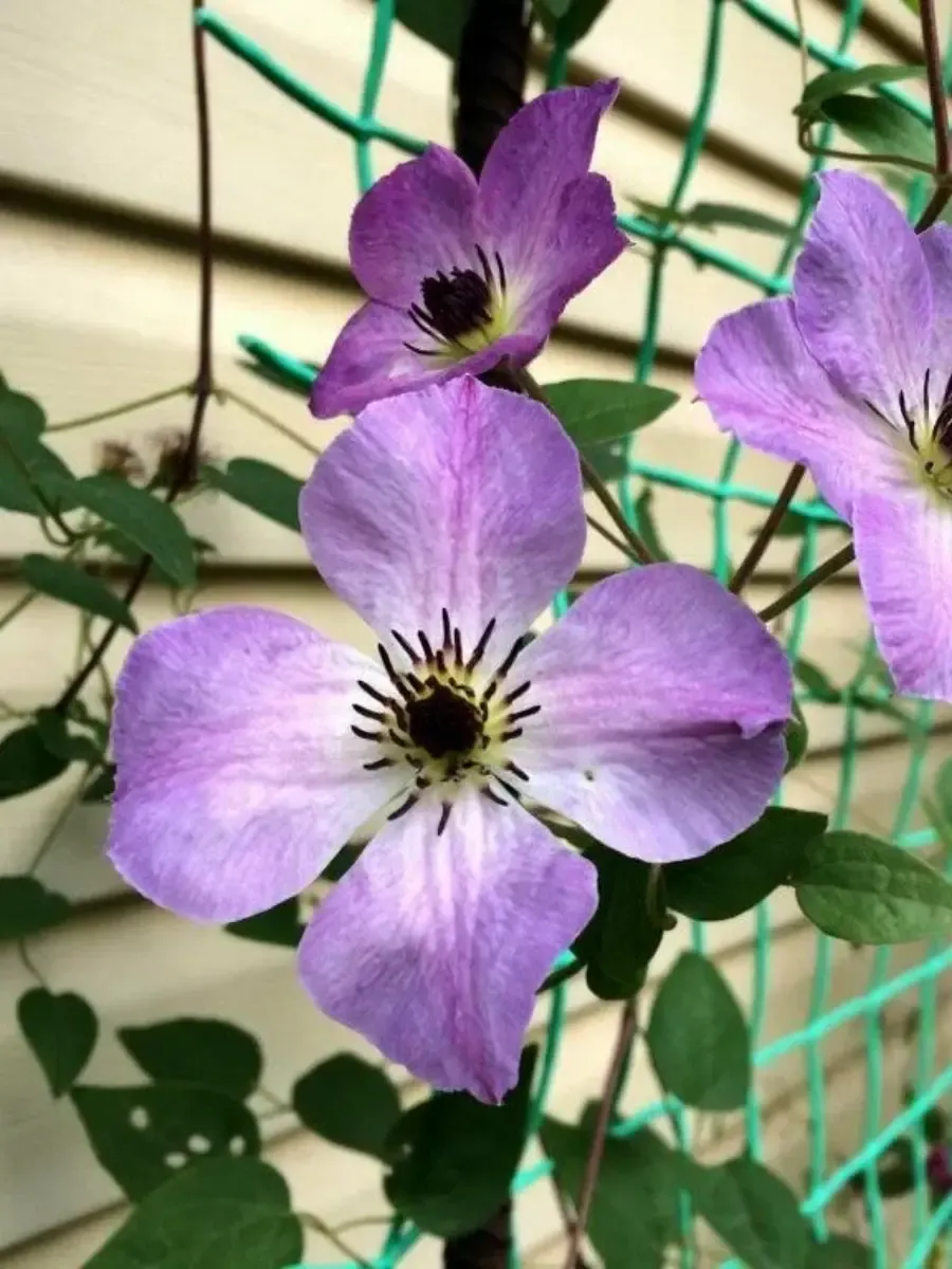Клематис гибридный *Morning Sky* пленяет взор нежностью своего цветения и утончённостью облика. Это элегантная лиана с гибкими побегами, достигающая высоты до трёх метров, украшенная крупными сердцевидными листьями насыщенного зелёного цвета, слегка блестящими от природы. Цветки распускаются щедро и обильно, словно утреннее небо, раскрашенное пастельными оттенками нежно-голубого и светло-фиолетового цветов, переходящих друг в друга мягкими переливами. Лепестки широкие, бархатистые, слегка волнистые по краям, придают растению особую воздушность и лёгкость. Бутоны раскрываются постепенно, начиная с июня и продолжаясь вплоть до первых осенних заморозков, создавая впечатление бесконечного праздника красок среди зелени сада.