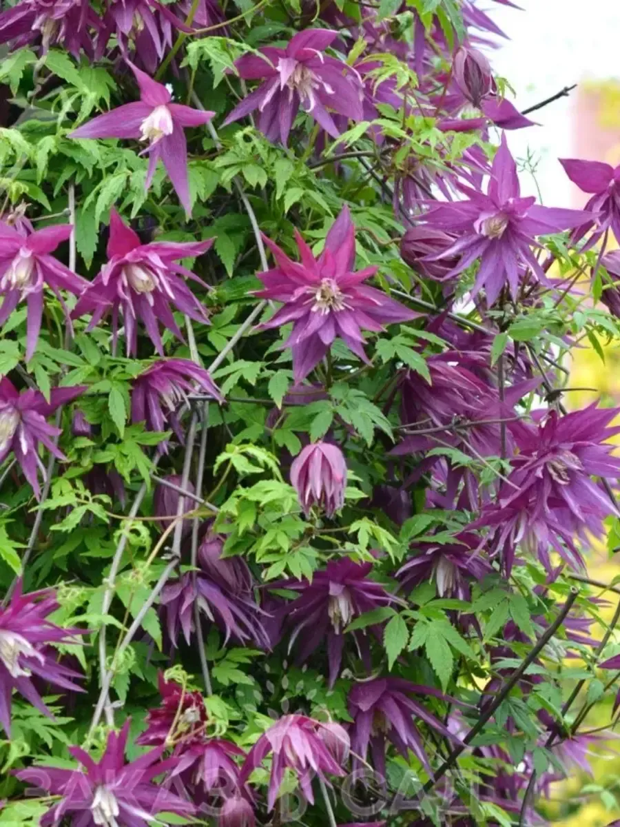 Клематис гибридный *Purple Surprise* пленяет взор роскошной палитрой оттенков от насыщенного пурпурного до глубокого фиолетового цвета, переливающегося бархатом лепестков крупных цветков диаметром около десяти сантиметров. Листья рассечённые, тёмно-зелёные, слегка блестящие, придают растению элегантную строгость и подчёркивают изысканность соцветий. Цветёт обильно и продолжительно, начиная с конца весны и вплоть до осени, украшая сады нежностью своего цветения. Мощная лиана быстро разрастается, достигая высоты трёх метров, легко цепляясь гибкими побегами за опоры и создавая живописные зелёные стены, увитые цветами. Этот сорт предпочитает солнечные места, плодородные почвы и умеренный полив, демонстрируя свою неприхотливость и способность адаптироваться к различным условиям выращивания.