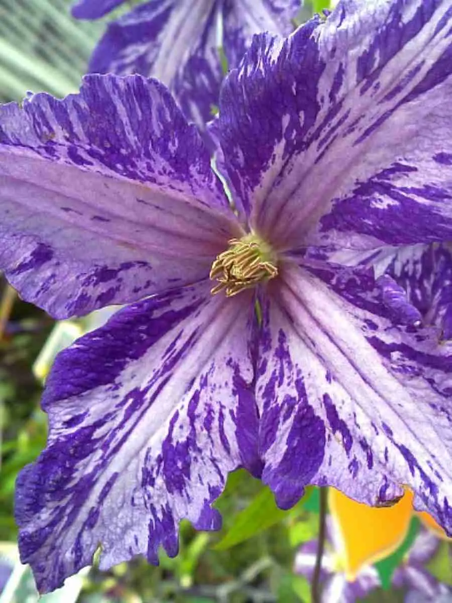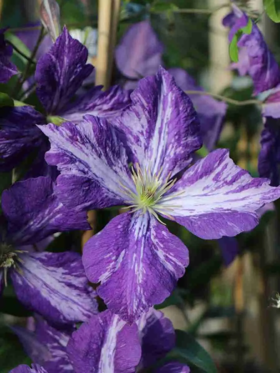 Клематис сорта *Tie Dye* пленяет взор роскошной палитрой цветов и утончённой формой цветков. Его крупные бутоны раскрываются пышными звёздчатыми цветами диаметром до 15 см, демонстрируя удивительную игру оттенков от нежнейшего розового до насыщенного малинового цвета с белыми мазками и переливами фиолетовых теней. Листья тёмно-зелёные, рассечённые, придают растению элегантность и свежесть. Цветёт обильно и продолжительно, начиная с июня и заканчивая глубокой осенью, украшая сады яркими красками даже после первых заморозков. Стебли гибкие, быстрорастущие, достигают длины около трёх метров, легко обвивая опоры и создавая живописную живую ширму. Этот клематис предпочитает солнечные места, плодородные почвы и умеренный полив, прекрасно адаптируясь к различным климатическим условиям средней полосы России.