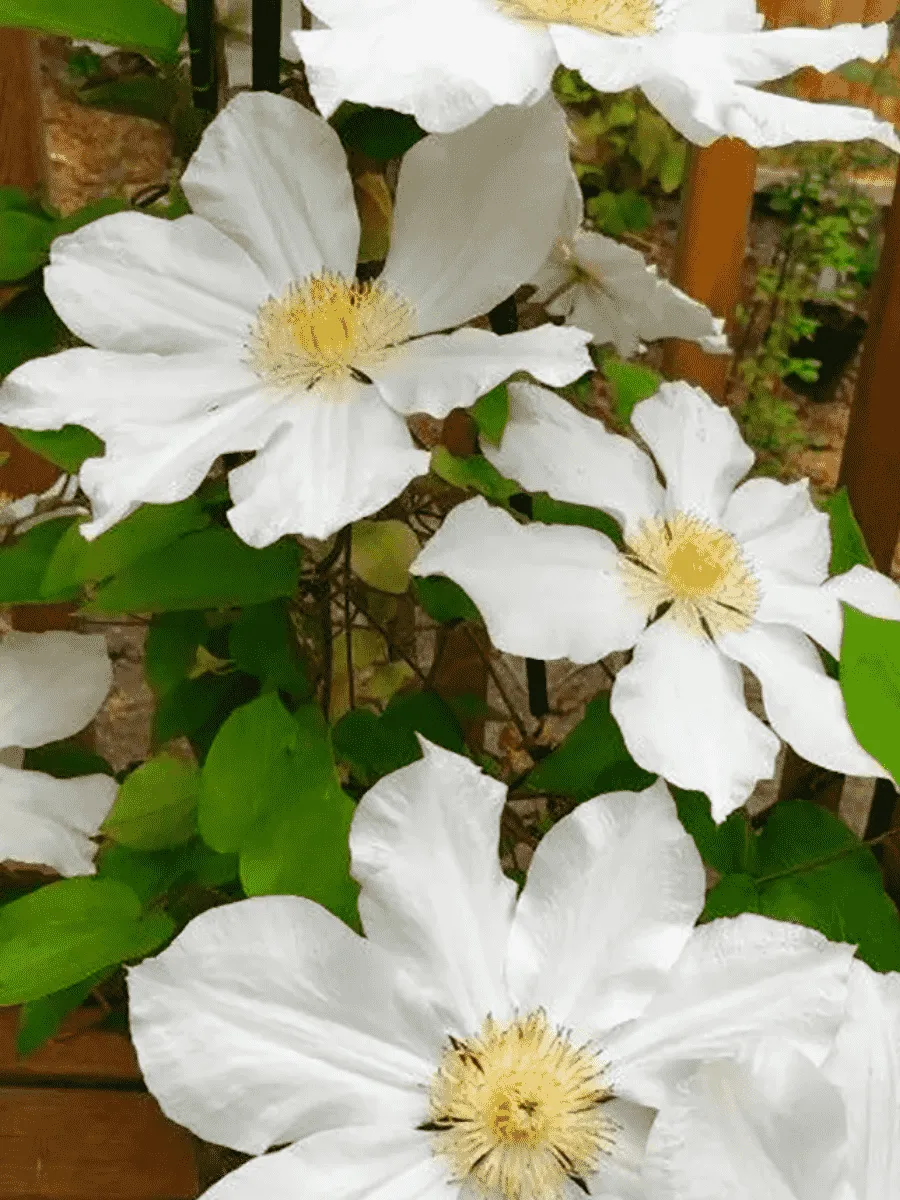 Клематис Toki очаровывает своей утончённой красотой и элегантностью форм. Это многолетняя лиана с гибкими побегами, достигающими длины до трёх метров, легко взбирающаяся вверх благодаря крепким усикам-листочкам. Листья тёмно-зелёные, блестящие, рассечённые на три овальных сегмента с волнистым краем, придающие растению свежесть и воздушность облика. Цветки крупные, диаметром около десяти сантиметров, распускаются в июне–июле, поражают нежной белизной лепестков, слегка отливающих перламутром, контрастируя с ярко-жёлтыми тычинками, собранными в центре цветка. Бутоны раскрываются постепенно, создавая эффектную композицию из цветков разной степени раскрытия. Растёт быстро, предпочитает солнечные места и плодородные почвы, широко используется в вертикальном озеленении садов и парков, украшая беседки, арки и стены зданий своим роскошным цветением.