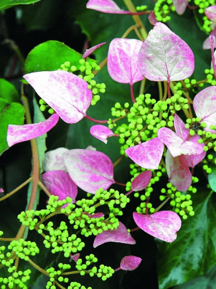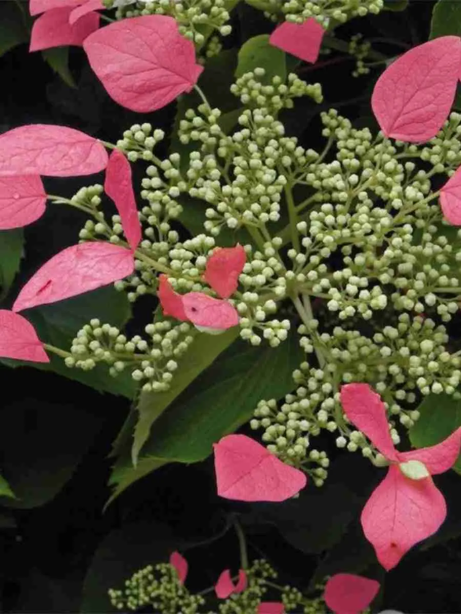 Схизофрагма гортензиевидная Roseum (Schizophragma hydrangeoides 'Roseum') — очаровательное листопадное растение семейства Адоксовые, покоряющее сердца садоводов нежностью цветения и элегантной листвой. Это кустарникоподобная древесная лиана высотой до трёх метров, обладающая гибкими побегами, легко цепляющимися за опоры благодаря особым выростам-присоскам. Листья крупные, сердцевидные, ярко-зелёные летом и окрашивающиеся осенью в насыщенные оттенки жёлтого и оранжевого цветов. Особого внимания заслуживает её роскошное цветение: многочисленные соцветия напоминают миниатюрные букеты розовых гортензий, состоящие из мелких цветков с белыми лепестками и яркими пурпурными чашелистиками, придающими растению особую декоративность. Цветёт схизофрагма обильно и продолжительно, начиная с конца мая и заканчивая серединой июля, украшая собой тенистые уголки сада и создавая атмосферу утончённой природной красоты.