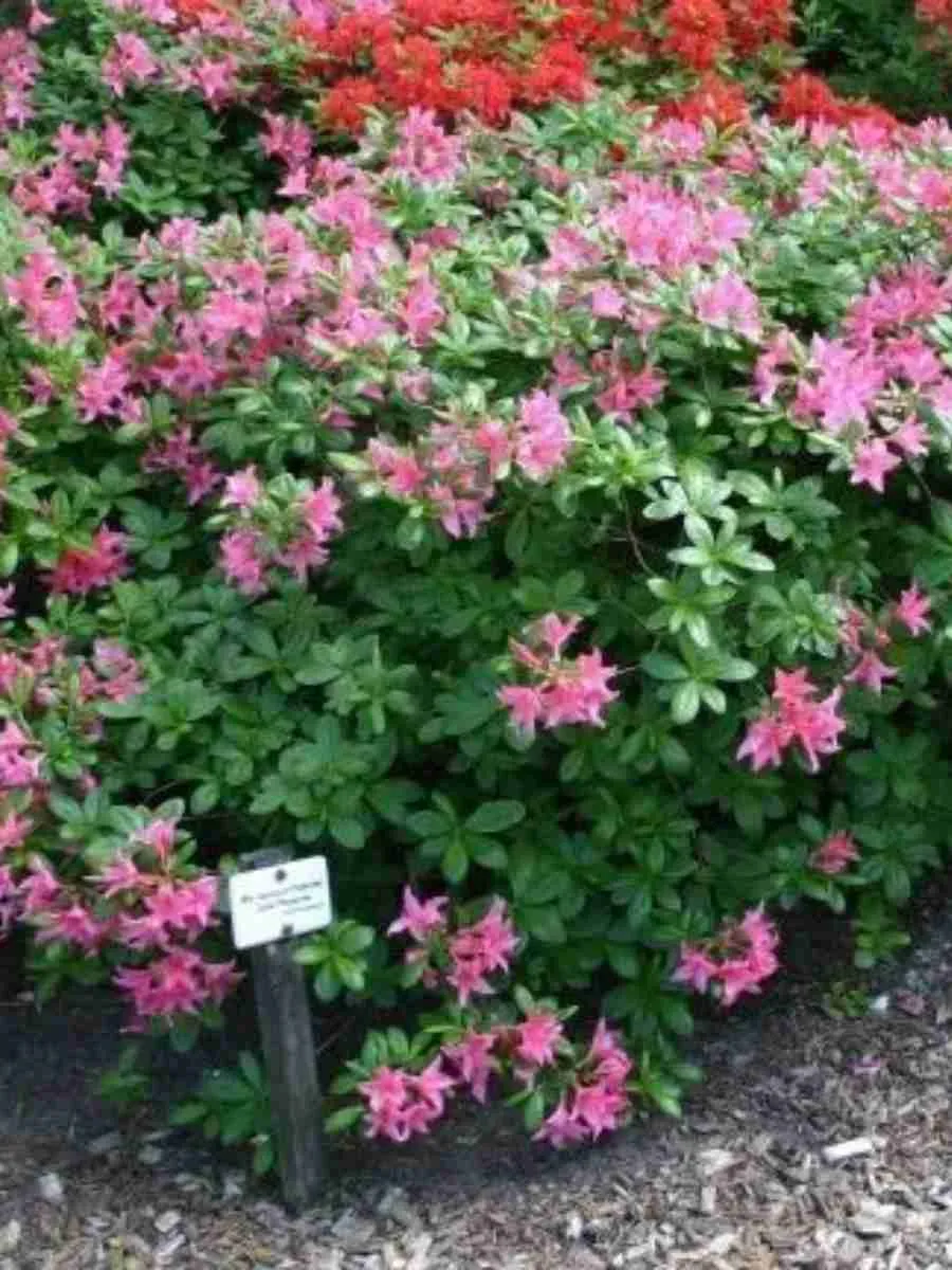 Азалия крупноцветковая *Jolie Madame* пленяет взор изысканным очарованием своего цветения и утончённой красотой листвы. Это вечнозелёный кустарник высотой до полутора метров, обладающий густой кроной и элегантной формой ветвей. Листья небольшие, овальные, тёмно-зелёные сверху и слегка серебристые снизу, гладко блестящие, словно покрытые тонким слоем воска. Цветки крупные, диаметром около восьми сантиметров, собраны в пышные соцветия, распускаются ранней весной, наполняя сад нежностью и ароматом. Лепестки бархатисто-розовые, иногда с лёгким пурпурным оттенком, края волнистые, придающие цветкам особую воздушность и хрупкость. Растёт азалия медленно, предпочитая полутень и влажную плодородную почву, распространена преимущественно в садах умеренного климата Европы и Северной Америки, где её ценят за декоративность и способность создавать атмосферу романтического уюта и гармонии.