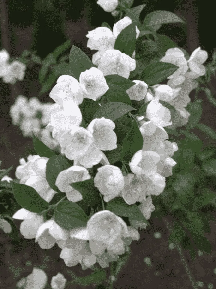 Чубушник сорта *Lemoine Alabaster* представляет собой элегантный кустарник высотой до двух метров с раскидистой кроной и гибкими побегами, покрытыми гладкой серо-зелёной корой. Листья овально-ланцетные, слегка блестящие, насыщенно зелёного цвета с лёгким серебристым отливом, придающим растению особую свежесть и благородство облика. Цветёт обильно и продолжительно, начиная с конца мая и вплоть до середины июля, покрываясь крупными ароматными цветами кремово-белого оттенка, собранными в пышные кистевидные соцветия. Бутоны раскрываются постепенно, наполняя сад нежным ароматом жасмина, создавая атмосферу утончённой красоты и гармонии. Растение предпочитает солнечные места, хорошо переносит стрижку и легко адаптируется к различным типам почв, благодаря чему широко используется в ландшафтном дизайне парков, садов и частных участков.