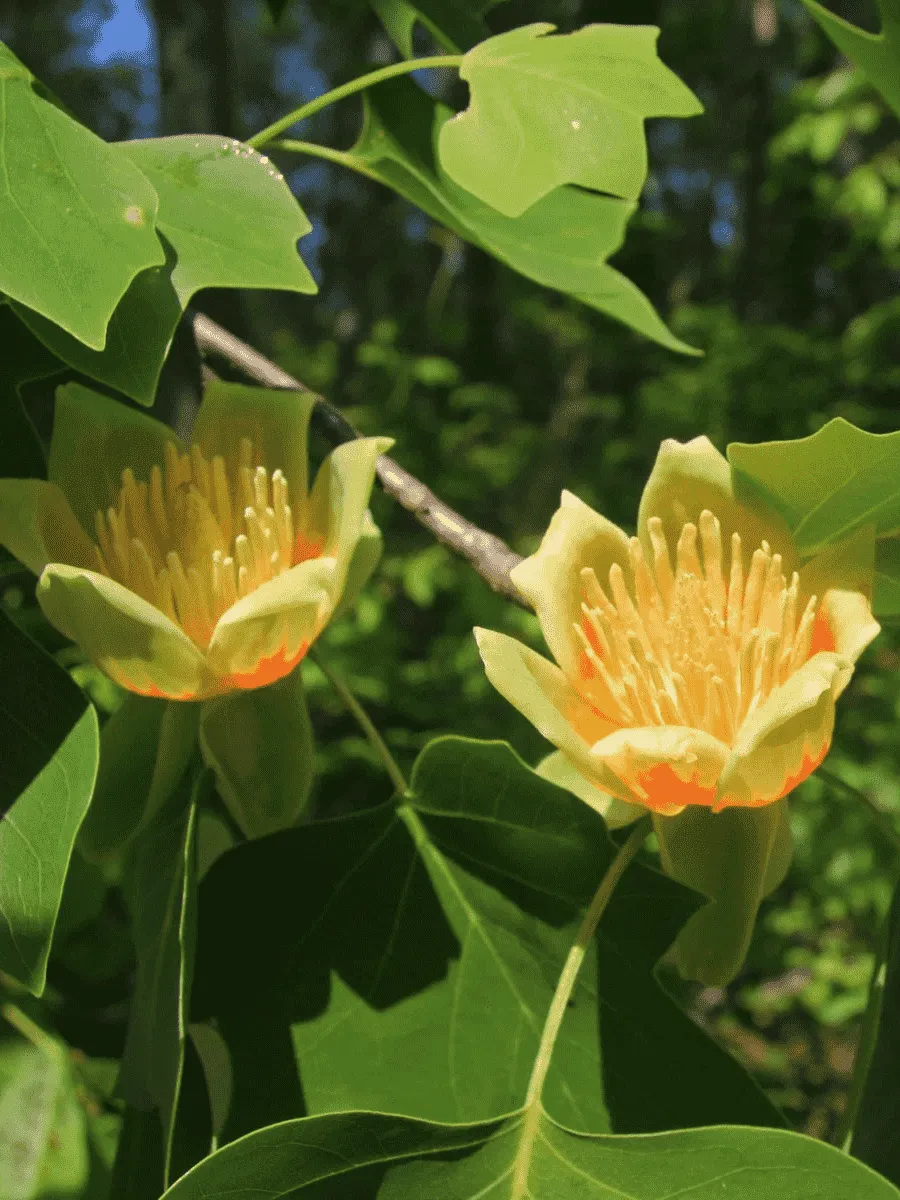 Лириодендрон тюльпановый — величественное дерево семейства магнолиевых, поражающее своей стройностью и элегантностью. Его мощный прямой ствол устремляется вверх, поддерживая раскидистую крону, состоящую из крупных четырёхлопастных листьев изумрудной окраски, формой напоминающих силуэт маленьких сердец. Листья расположены очередно, создавая живописную мозаику зелени, особенно эффектную осенью, когда приобретают яркие оттенки жёлтого и золотистого цветов. Цветёт лириодендрон крупными одиночными цветами, похожими на раскрытые бутоны тюльпанов, от которых растение получило своё название. Белые лепестки украшены лимонно-жёлтыми штрихами и оранжевым пятном внутри, придавая цветкам особую декоративность. Дерево предпочитает плодородные почвы и влажный климат умеренных широт, распространено преимущественно в Северной Америке, где достигает внушительных размеров, становясь украшением парков и садов благодаря своему благородному облику и изысканной красоте цветения.