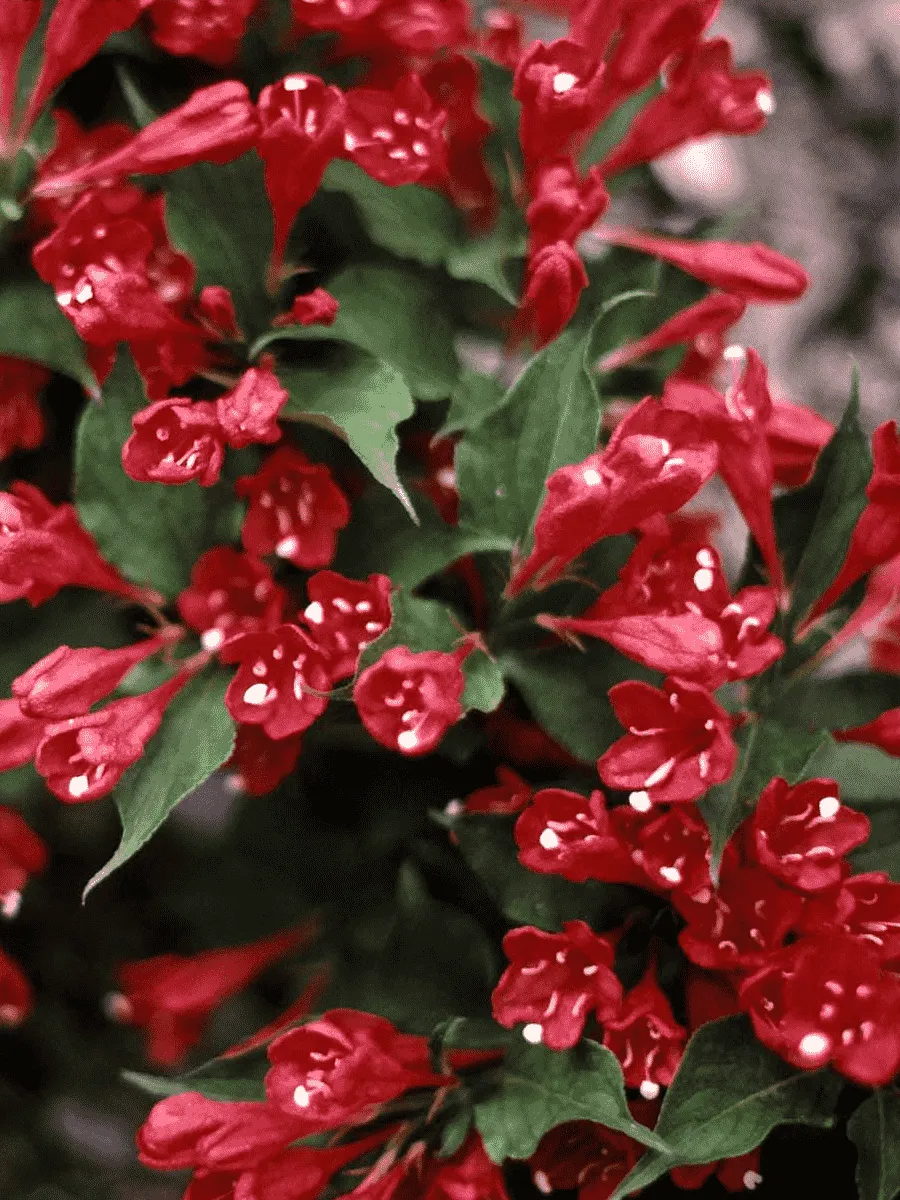 Вейгела цветущая сорта *Red Prince* представляет собой живописный листопадный кустарник высотой до двух метров, обладающий раскидистой кроной и элегантной формой ветвей. Листья овально-заострённые, насыщенно-зелёные летом и приобретающие яркие оттенки оранжевого и красного осенью, придают растению особую декоративность во время смены сезонов. Цветёт обильно и продолжительно, начиная с конца мая и вплоть до июля, покрываясь крупными трубчатыми цветами глубокого рубинового оттенка, собранными в рыхлые соцветия. Эти роскошные цветы привлекают внимание своей интенсивностью цвета и изысканной формой венчика, создавая эффектную игру света и тени среди зелёной листвы. Растение предпочитает солнечные места и плодородные почвы, хорошо переносит обрезку и легко адаптируется к различным климатическим условиям, становясь украшением садов и парков благодаря своему пышному облику и длительному периоду цветения.
