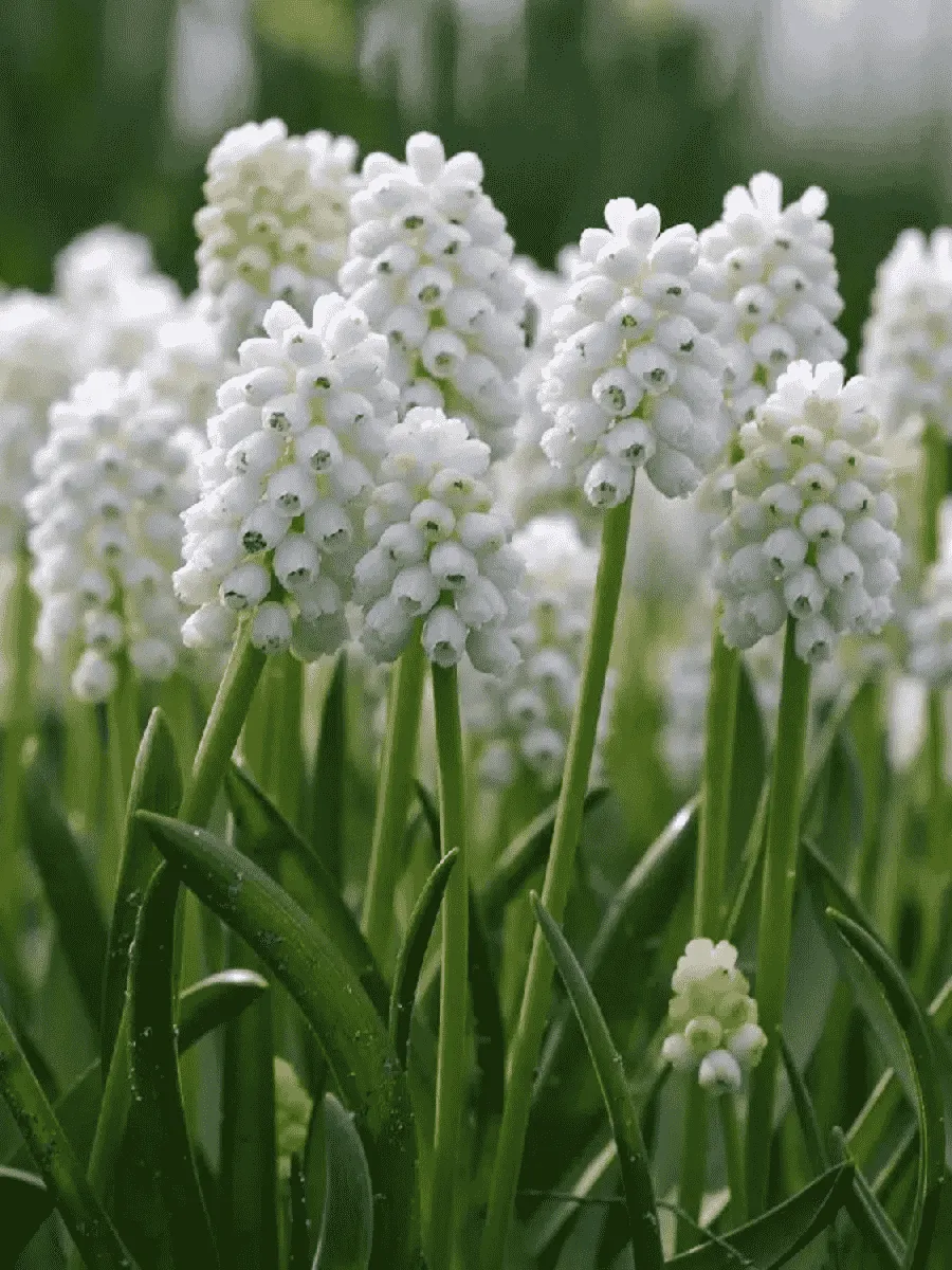 Мускари сорта *White Magic* очаровывает своей утончённой красотой и нежностью форм. Это миниатюрное растение высотой всего около десяти сантиметров обладает узкими линейными листьями насыщенного зелёного цвета, придающими композиции лёгкость и воздушность. Цветки собраны в плотную кисть цилиндрической формы, возвышающуюся над листвой подобно белоснежной свечке. Белоснежная окраска цветков подчёркивает чистоту и элегантность растения, создавая контраст с окружающей зеленью сада. Период цветения приходится на раннюю весну, когда природа ещё только просыпается от зимнего сна. Благодаря компактности и неприхотливости мускари прекрасно подходит для оформления альпийских горок, рокариев и миксбордеров, где становится ярким акцентом среди первых весенних цветов. Разрастаясь небольшими группами, мускари легко адаптируется к различным условиям выращивания, предпочитая солнечные места и умеренно влажные почвы.