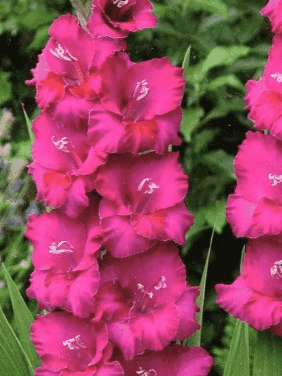 Гладиолус сорта *Cobra* пленяет взор изысканным сочетанием элегантности и экзотики. Его высокие стройные стебли достигают метра высоты, увенчанные роскошными соцветиями, состоящими из крупных цветков оригинальной формы. Лепестки цветов слегка загнуты назад, создавая эффектную воронковидную чашу, словно готовую раскрыться навстречу солнцу. Окраска лепестков варьируется от насыщенного тёмно-красного до пурпурного оттенка с золотистыми штрихами и пятнами, придающими особую декоративность каждому цветку. Листья гладиолуса узколинейной формы, длинные и тонкие, образуют пышную зелёную розетку вокруг основания цветка, подчёркивая грациозность всего растения. Цветёт этот великолепный представитель семейства Ирисовых продолжительно, радуя глаз яркими красками с июля по сентябрь. Предпочитает солнечные участки и плодородные почвы, легко адаптируется к различным климатическим условиям, становясь украшением садов и парков, где бы ни произрастал.