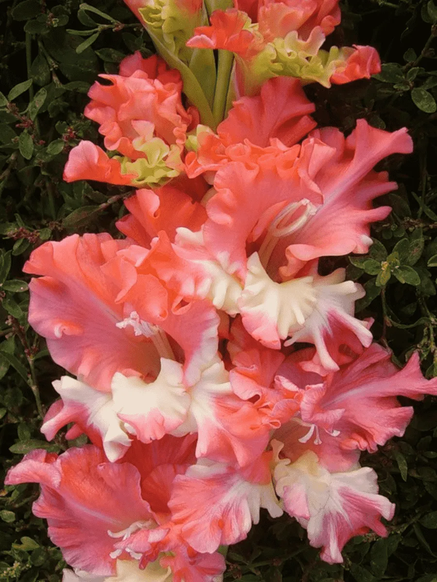 Гладиолус сорта *Frizzled Coral Lace* пленяет взор изысканным сочетанием нежности и элегантной строгости. Его высокие стройные стебли достигают метра высоты, увенчанные роскошными соцветиями, состоящими из множества крупных цветков, словно сотканных из тонкого кружева. Лепестки цветов слегка волнистые, нежно-розового оттенка с едва заметным коралловым отливом, придающим особую глубину и очарование каждому лепестку. Листья узколинейные, длинные и острые, насыщенного зелёного цвета, образуют пышную прикорневую розетку, подчёркивая вертикальную устремлённость всего растения. Цветёт гладиолус продолжительно, радуя глаз яркими красками с конца лета до первых осенних холодов. Предпочитает солнечные места и плодородные почвы, легко адаптируется к различным климатическим условиям, демонстрируя свою неприхотливость и способность украшать сады даже в регионах с умеренным континентальным климатом.
