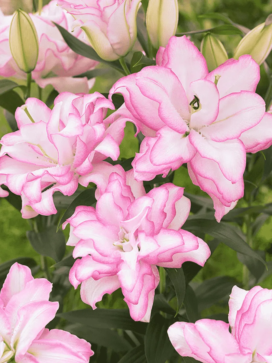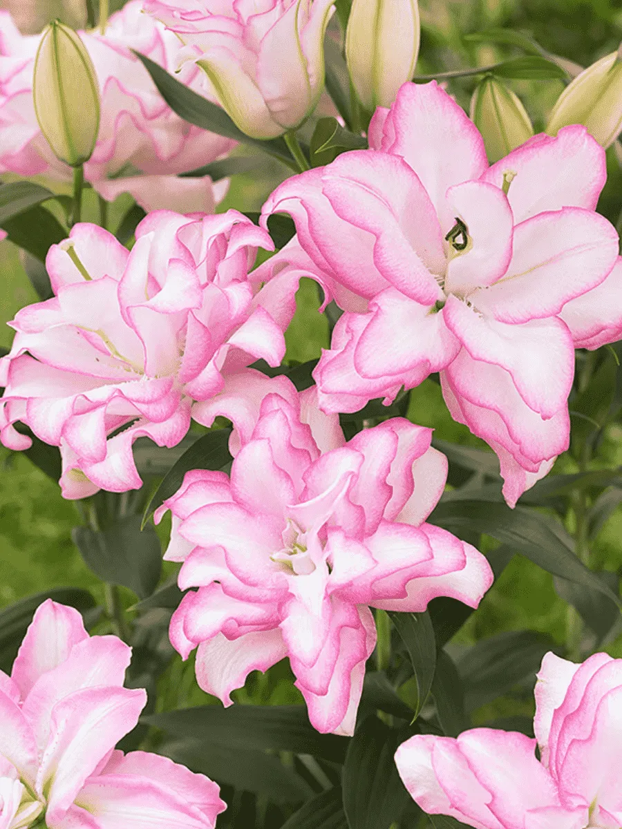 Лилия сорта *Roselily Anouska* пленяет взор изысканным сочетанием нежности и благородства форм. Её стройные стебли достигают высоты до одного метра, увенчанные крупными цветами диаметром около двадцати сантиметров. Лепестки нежно-розового оттенка плавно переходят от светлого основания к насыщенному краю, украшенные тонкими пурпурными штрихами и золотистыми тычинками, придающими особую утончённость композиции. Листья ланцетовидные, тёмно-зелёные, гладкие и блестящие, гармонично подчёркивающие красоту цветков. Цветёт лилия продолжительно, начиная с июля и заканчивая августом, наполняя сад тонким ароматом и создавая атмосферу элегантной роскоши. Предпочитает солнечные участки с плодородной почвой, устойчива к холоду и неприхотлива в уходе, легко размножается луковицами и прекрасно подходит для срезки и украшения садов.