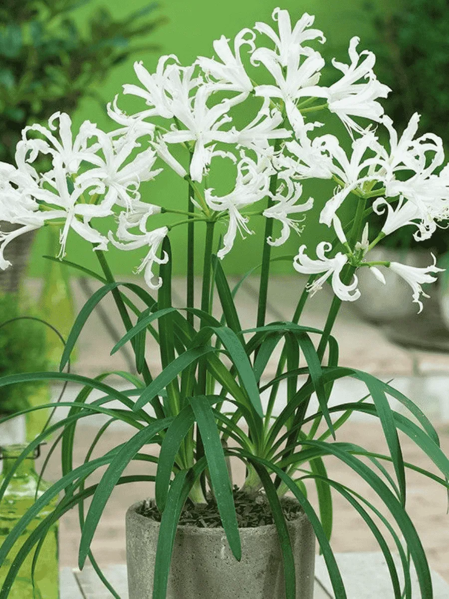Нерина Боуден белая (Nerine bowdenii 'Alba') пленяет взор нежностью белоснежных цветков, собранных в роскошные зонтичные соцветия, возвышающиеся над изумрудной лиственной массой. Листья узколанцетные, гладко очерченные, слегка волнистые по краям, образуют плотную прикорневую розетку, словно зелёная манишка, подчёркивающая элегантность цветка. Цветки крупные, диаметром до восьми сантиметров, лепестки тонкие, полупрозрачные, будто сотканные из лунного света, венчик состоит из шести широких сегментов, плавно изгибающихся назад, создавая впечатление танцующих фигурок. Тычинки длинные, ярко-жёлтые, контрастируют с чистотой белого цвета лепестков, придавая особую декоративность растению во время цветения осенью. Корневище луковичное, покрытое сетчато-волокнистым покровом, позволяющее успешно переживать засушливые периоды. Родина нерины — Южная Африка, однако благодаря своей неприхотливости она прекрасно адаптировалась в садах умеренного климата Европы и России, украшая осенние дни своим изысканным очарованием.