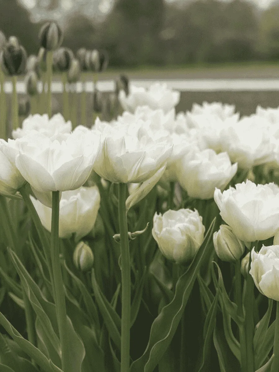 Тюльпан Mondial пленяет своей элегантностью и благородством форм: стройная прямая стрелка высотой около полуметра увенчана крупным бокалом цветка идеальной округлой формы, словно созданный рукой искуснейшего мастера. Лепестки нежно-белые, слегка отливающие перламутром, создают впечатление изысканной фарфоровой чаши, наполненной светом весеннего солнца. Листья тёмно-зелёные, гладкие и блестящие, подчёркивают чистоту и свежесть цветков, располагаясь компактной розеткой у основания стебля. Цветёт тюльпан Mondial поздно весной, радуя глаз продолжительное время своим великолепием и очарованием. Растение неприхотливо, предпочитает солнечные места и плодородную почву, легко размножается луковицами и широко используется в ландшафтном дизайне парков и садов, создавая атмосферу утончённой красоты и гармонии природы.