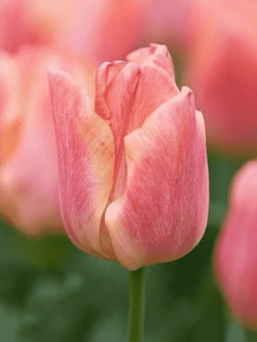Тюльпан сорта *Passio Sweet* пленяет взор нежностью лепестков, переливающихся оттенками от розового до кремово-белого цвета, словно облачённых в лёгкую дымку утреннего тумана. Его крупные цветки чашевидной формы раскрываются навстречу солнечным лучам, демонстрируя изысканный переход оттенков от основания к краям лепестков. Листья удлинённые, гладкие, насыщенно-зелёного оттенка, подчёркивающие элегантность стебля высотой около сорока сантиметров. Цветёт тюльпан ранней весной, наполняя сад тонким ароматом свежести и весенней радости. Растение предпочитает солнечные участки с плодородной почвой, легко адаптируется к различным климатическим условиям и прекрасно подходит для выращивания как в открытом грунте, так и в горшечной культуре. Этот сорт станет украшением любого сада благодаря своей утончённой красоте и способности создавать атмосферу гармонии и спокойствия.