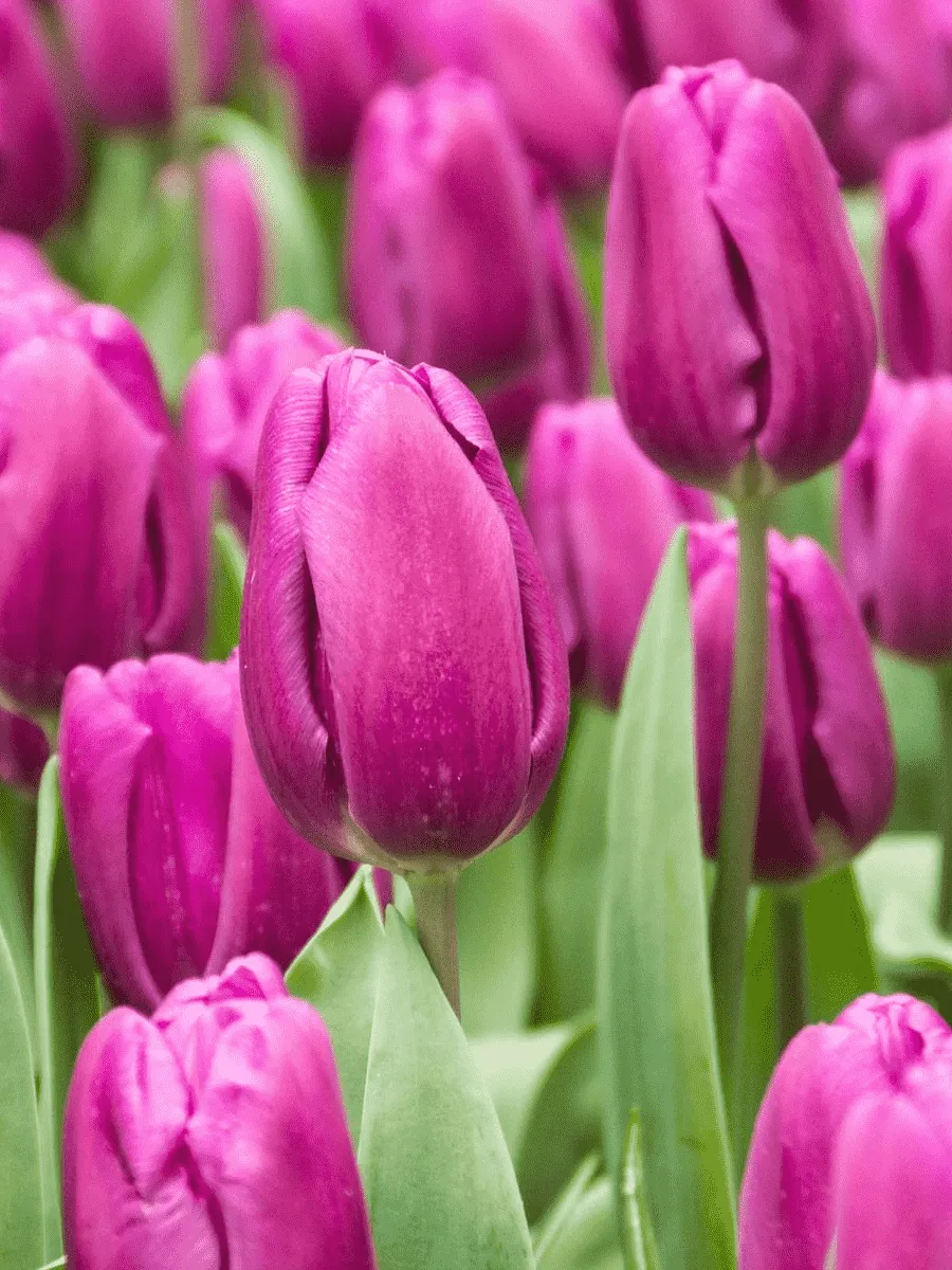 Тюльпан Purple Flag — изысканное растение семейства лилейных, покоряющее сердца садоводов своей утончённой красотой и благородством форм. Листья тёмно-зелёные, гладкие, блестящие, слегка вытянутые, словно бархатные ленты, подчёркивающие элегантность цветка. Стебель крепкий, прямой, высотой около полуметра, уверенно держит роскошную чашу бутонов. Цветки крупные, воронковидные, раскрываются навстречу солнцу, демонстрируя великолепие глубокого фиолетово-пурпурного оттенка, переходящего в насыщенно-бордовый тон ближе к основанию лепестков. Сердцевина украшена контрастной жёлтой полоской, придающей особую пикантность композиции. Период цветения приходится на апрель-май, когда сад наполняется чарующим ароматом и нежностью весеннего возрождения природы. Растёт тюльпан преимущественно в солнечных местах, предпочитая плодородные почвы, легко адаптируется к различным климатическим условиям, распространён в садах Европы и Северной Америки, где становится украшением клумб и парков, вызывая восхищённые взгляды ценителей прекрасного.