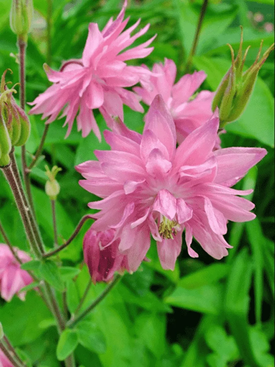 Аквилегия обыкновенная сорта Барлоу Пинк (Aquilegia vulgaris 'Barlow Pink') пленяет взор нежностью своего облика и утончённостью форм. Это травянистое многолетнее растение достигает высоты около полуметра, украшая садовые композиции своими ажурными листьями, рассечёнными на узкие сегменты, словно кружево, сотканное природой. Листья насыщенного зелёного цвета придают растению свежесть и лёгкость, контрастируя с воздушными соцветиями. Цветки аквилегии Барлоу Пинк раскрываются в конце весны — начале лета, демонстрируя изысканные оттенки розового и кремово-белого цветов. Лепестки слегка загнуты назад, создавая впечатление хрупких чашечек, наполненных светом и ароматом. Из центра цветка выглядывают длинные шпорцы, придающие особую декоративность и очарование этому виду. Растёт аквилегия свободно, легко адаптируясь к различным условиям сада, предпочитая полутень и умеренно влажную почву. Её присутствие наполняет пространство грациозной красотой и дарит ощущение гармонии с окружающим миром.