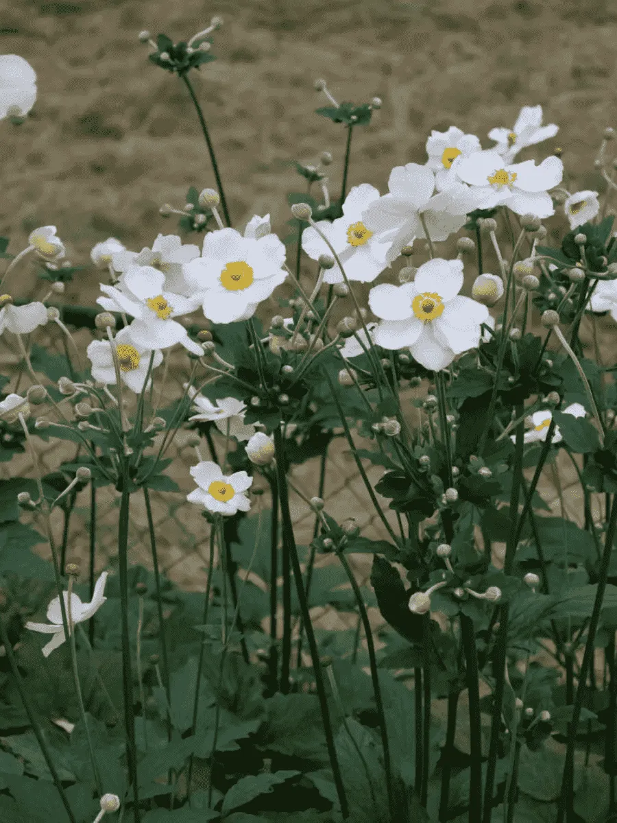 Анемона японская сорта *Honorine Jobert* пленяет взор своей утончённой красотой и нежностью форм. Это многолетнее травянистое растение достигает высоты около метра, обладая прямостоячими стеблями, покрытыми крупными рассечёнными листьями насыщенного зелёного цвета, словно вырезанными искусной рукой мастера. Листья имеют глубокую пальчато-раздельную структуру, создавая впечатление ажурной кружевной ткани, украшающей каждый побег. Цветки анемоны поражают белизной лепестков, контрастирующих с ярко-жёлтым центром, состоящим из многочисленных тычинок, собранных в плотную сердцевину. Бутоны раскрываются постепенно, демонстрируя свою элегантность и грациозность во всей красе. Период цветения начинается поздним летом и продолжается до первых заморозков, наполняя сад изысканным очарованием осени. Растёт анемона медленно, предпочитая полутень и влажные плодородные почвы, формируя живописные группы, способные украсить любой уголок сада своим благородством и спокойствием.