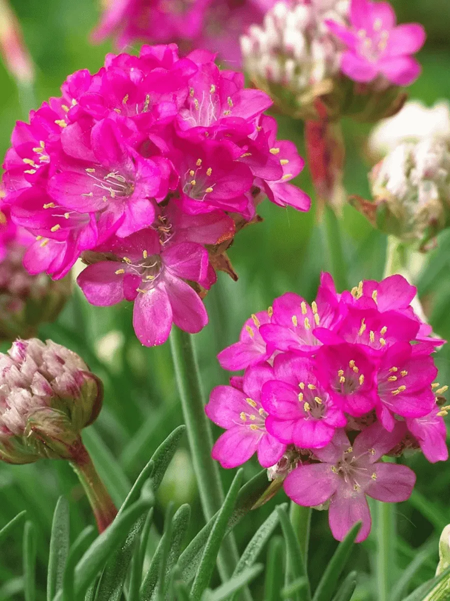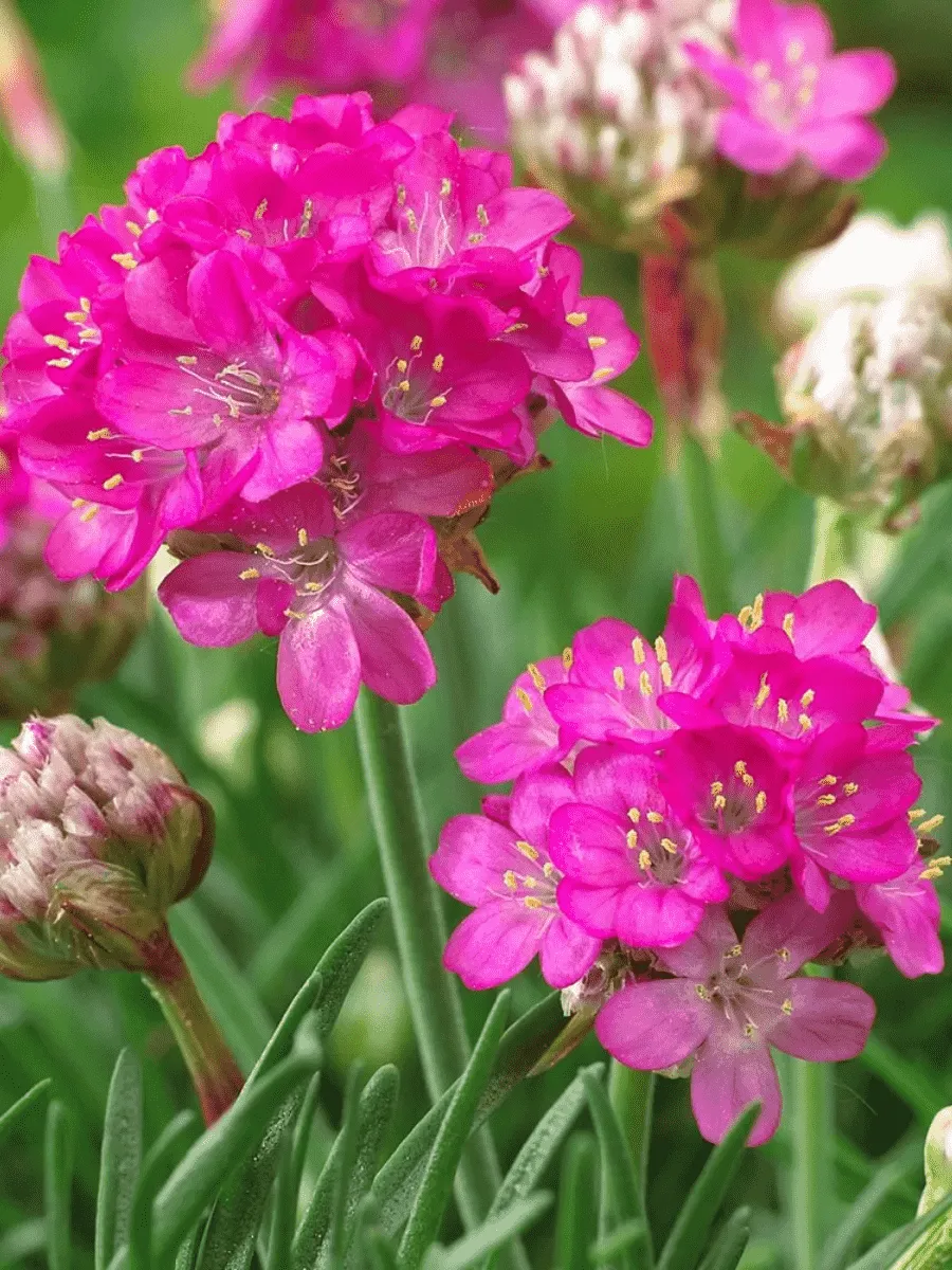 Армерия приморская сорта *Armada Rose* — очаровательное многолетнее растение семейства свинчатковые (Plumbaginaceae), покоряющее сердца садоводов своей неприхотливостью и изысканной красотой. Невысокие кустики высотой до 15–20 см образуют плотную аккуратную подушку густых узких серебристо-зелёных листочков, словно покрытых нежной дымкой. Листья линейные, тонкие, слегка свернутые вдоль центральной жилки, придают растению особую воздушность и лёгкость. Цветёт армерия обильно и продолжительно, начиная с конца весны и вплоть до осени, покрываясь множеством мелких розовых цветков, собранных в компактные шаровидные соцветия, похожие на миниатюрные помпончики. Эти яркие цветы будто парят над листвой, создавая иллюзию пушистого облака, плавно колышущегося от малейшего дуновения ветра. Растение предпочитает солнечные места и хорошо дренированные почвы, легко переносит засуху и морозы, становясь украшением каменистых садиков, альпийских горок и бордюров.