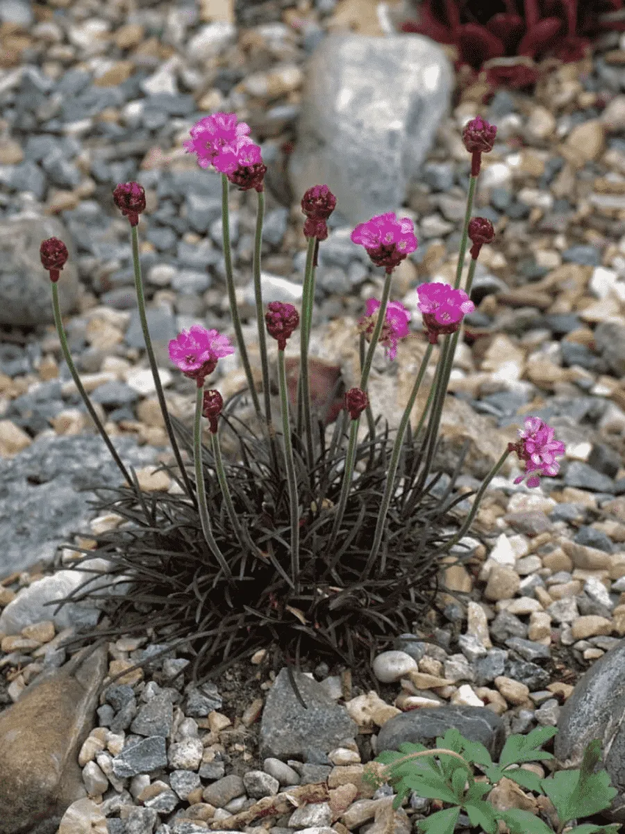 Армерия приморская сорта *Vesuvius* предстает перед нами очаровательным многолетником, покоряя сердца садоводов своей неприхотливостью и изысканной красотой. Ее компактная форма напоминает миниатюрную подушечку, густо покрытую узкими линейчатыми листьями насыщенного серовато-зелёного оттенка, словно покрытыми тонким слоем благородной пыли. Из этой плотной зелени весной поднимаются тонкие прочные стебли высотой до 45 см, увенчанные пышными шаровидными соцветиями, состоящими из множества мелких цветков нежнейшего розово-пурпурного цвета, переливающихся оттенками от бледно-розового до глубокого винного тона. Цветение продолжается долго, радуя глаз с мая по июль, создавая впечатление живописного морского пейзажа, где волны цветов плавно перекатываются над поверхностью земли. Растение предпочитает солнечные места и хорошо дренированные почвы, легко переносит засуху и морозы, становясь украшением каменистых садиков, альпийских горок и бордюров, добавляя саду нотки природной элегантности и утончённости.