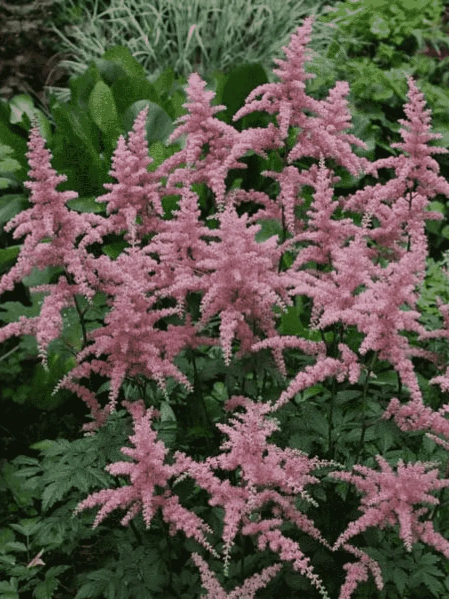Астильба Арендса сорта *Bressingham Beauty* пленяет взор нежностью своего облика и изысканностью форм. Это многолетнее травянистое растение образует пышную куртину высотой до полуметра, украшенную крупными перисто-рассечёнными листьями насыщенного тёмно-зелёного цвета с глянцевой поверхностью, придающей растению благородство и утончённость. Цветёт астильба продолжительно, начиная с середины лета и заканчивая первыми осенними днями, покрываясь воздушными метельчатыми соцветиями нежно-розового оттенка, словно облачённая в лёгкий полупрозрачный шарф. Соцветия состоят из множества мелких цветков, источающих тонкий аромат, привлекающий насекомых-опылителей. Растение предпочитает тенистые влажные места, прекрасно чувствует себя вблизи водоёмов и в полутени деревьев, где создаёт живописные композиции, добавляя саду атмосферу романтизма и спокойствия.
