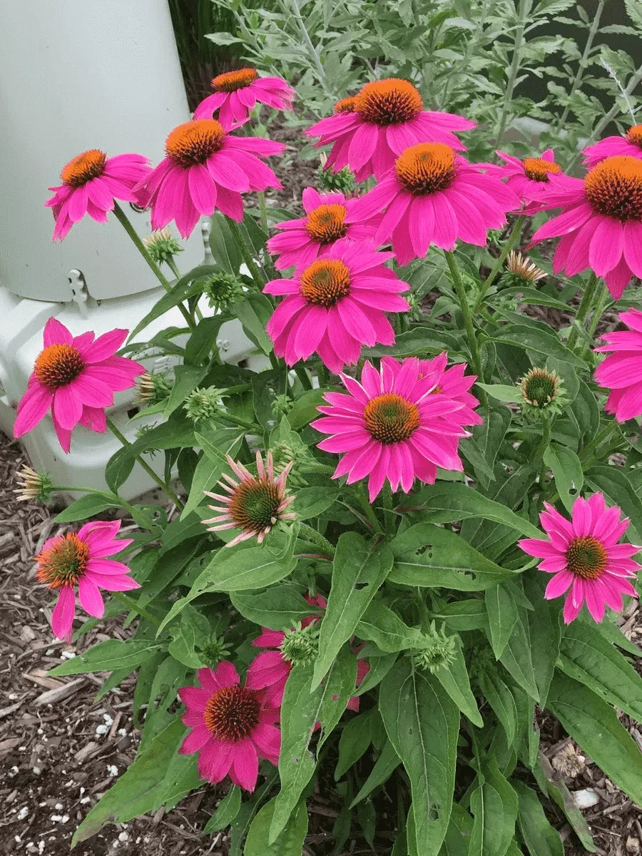Эхинацея пурпурная сорта *Pow Wow Wild Berry* пленяет взор своей изысканной красотой и благородством форм. Это многолетнее травянистое растение достигает высоты от 45 до 60 сантиметров, обладая компактной округлой формой куста, благодаря чему идеально вписывается даже в небольшие садовые композиции. Листья темно-зелёные, слегка шероховатые, овально-ланцетные, расположены очередно вдоль прямостоячих стеблей, создавая плотную зелёную массу. Цветки крупные, диаметром около 8–10 см, собраны в одиночные корзинки на концах крепких цветоносов. Лепестки насыщенного розово-пурпурного цвета плавно переходят в тёмно-красновато-коричневую центральную головку, придающую соцветиям особую декоративность и экзотичность. Период цветения продолжительный, начинается в июле и продолжается вплоть до сентября, украшая сады яркими красками и привлекая внимание насекомых-опылителей своим ароматом и живописностью. Растёт эхинацея быстро, легко размножается делением корневища и семенами, предпочитая солнечные места и плодородные почвы умеренной влажности.