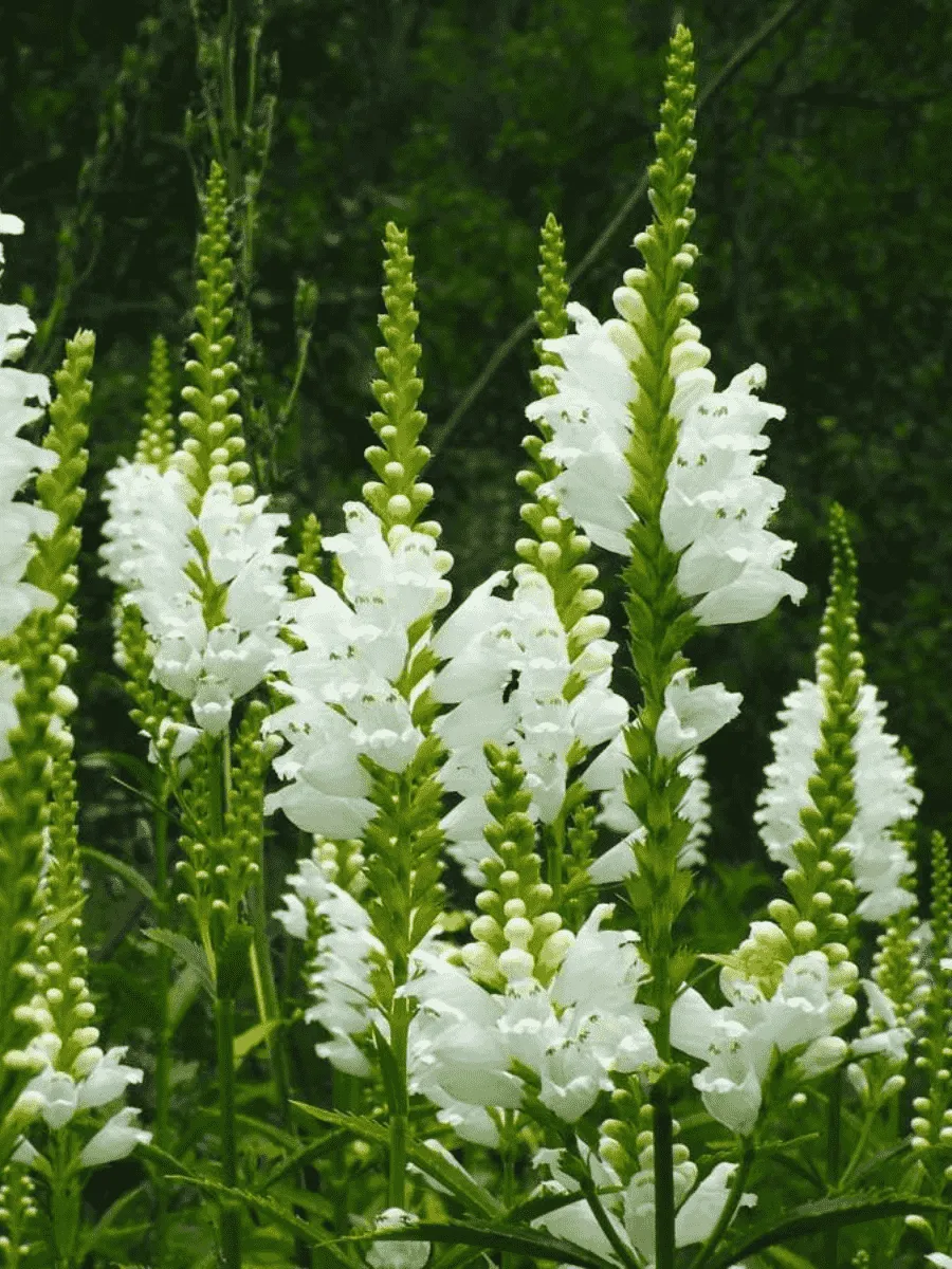 Физостегия виргинская сорта *Alba* — элегантная многолетняя травянистая красавица родом из Северной Америки, покорившая сердца садоводов своей утончённой простотой и благородством облика. Стройные прямостоячие стебли высотой до полутора метров несут узколанцетные листья насыщенного зелёного цвета, слегка шероховатые на ощупь, придающие растению особую свежесть и природную грацию. Но истинной жемчужиной физостегии являются её цветы — белые, трубчатые, собранные в плотные колосовидные соцветия длиной около двадцати сантиметров, словно нежнейшие свечи, горящие среди зелени сада. Цветёт растение обильно и продолжительно, начиная с конца июля и вплоть до первых осенних заморозков, наполняя пространство вокруг себя лёгким ароматом и привлекая пчёл и бабочек. Предпочитает солнечные места и плодородные влажные почвы, быстро разрастается благодаря подземным побегам, формируя живописные заросли, способные стать украшением любого участка.