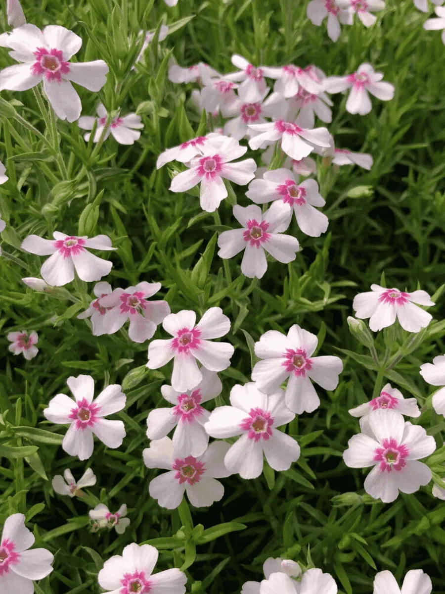 Флокс шиловидный сорта *Pharao Red Eye* представляет собой низкорослый многолетник, формирующий плотную зелёную подушку высотой всего около десяти сантиметров. Его узколинейные листья, словно тонкие иглы, густо покрывают стебли, создавая впечатление мягкого бархата. Цветки собраны в пышные соцветия диаметром до пяти сантиметров, раскрываются ранней весной и радуют глаз вплоть до начала лета. Окраска цветков необычайна: ярко-красная кайма окаймляет белоснежную сердцевину, придавая каждому лепестку эффектный контраст и глубину цвета. Растение предпочитает солнечные участки и хорошо дренированные почвы, легко размножается делением куста и черенкованием, быстро разрастаясь и заполняя пространство живописной ковровой мозаикой.