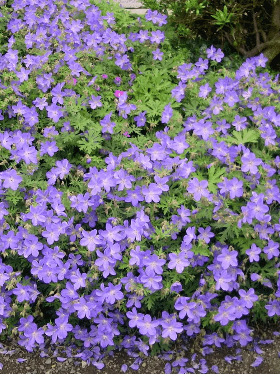 Герань садовая сорта *Johansons Blue* пленяет взор нежностью своего облика и изысканностью форм. Это компактное растение высотой около полуметра обладает прямостоячими стеблями, покрытыми мелкими волосками, придающими ей бархатистость. Листья округло-пятиугольной формы, глубоко рассечённые на узколанцетные сегменты, окрашены в насыщенный зелёный оттенок с лёгким серебристым отливом, словно отражающим солнечный свет. Цветки собраны в рыхлые зонтичные соцветия, возвышающиеся над листвой, каждый цветок состоит из пяти лепестков глубокого сине-фиолетового цвета, украшенных тонкой пурпурной штриховкой, будто нарисованной кистью художника. Бутоны раскрываются постепенно, создавая эффект непрерывности цветения с июня до сентября. Растение предпочитает солнечные места, хорошо дренированные почвы и умеренное увлажнение, легко адаптируется к различным условиям выращивания, радуя садоводов своей неприхотливостью и декоративностью.