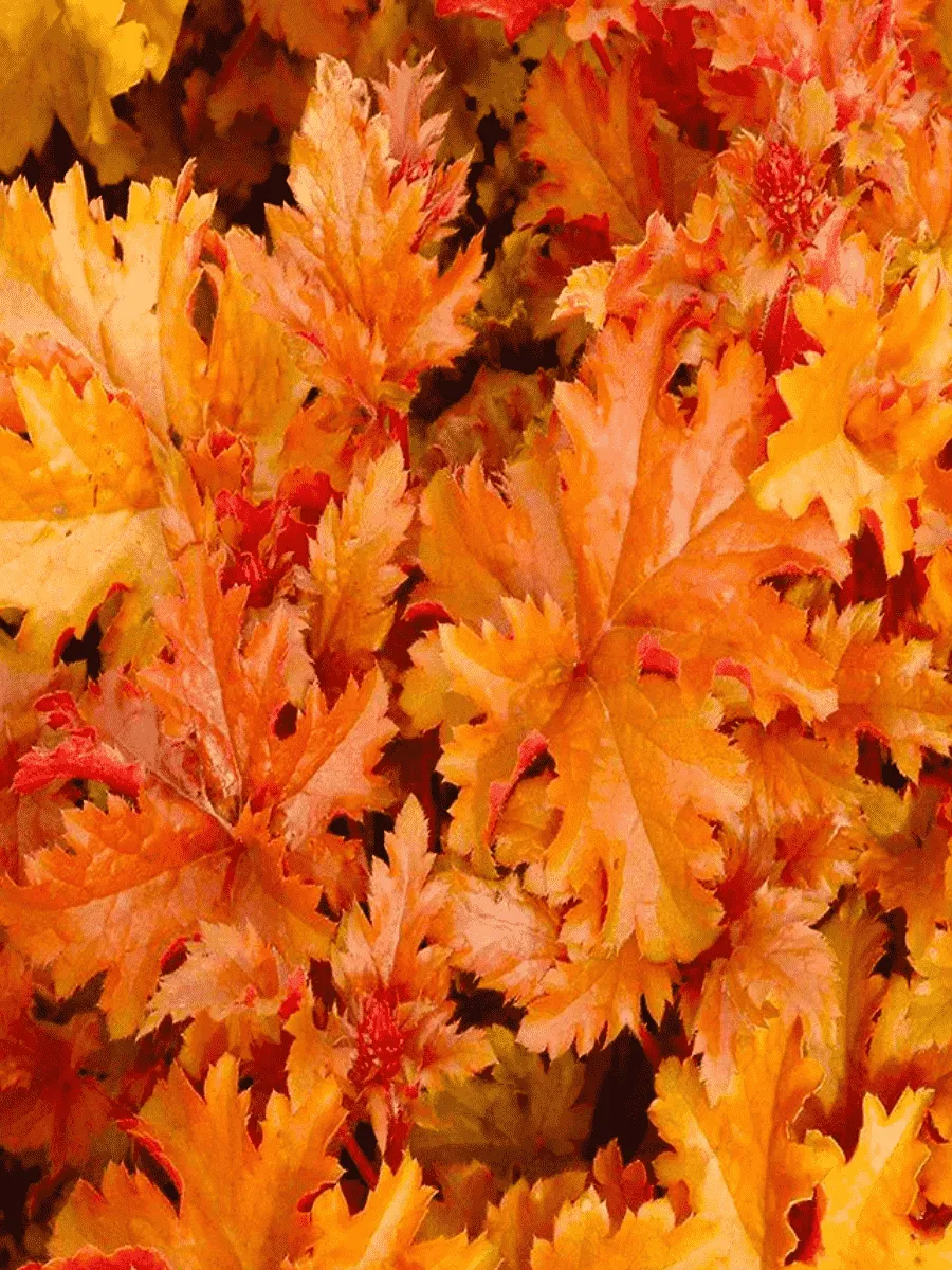 Гейхера сорта *Amber Waves* пленяет взор своей изысканной красотой и элегантностью форм. Листья её крупные, сердцевидные, рассечённые по краям волнистыми зубчиками, словно волны янтарной ряби, переливаются оттенками от золотисто-жёлтого до медово-оранжевого цвета, меняющегося в зависимости от освещения и сезона. Стебли тонкие, прочные, поднимают над лиственной массой нежные соцветия-метёлки, состоящие из множества мелких цветков розовато-белого оттенка, украшенных тонкими тычинками, придающими особую воздушность и лёгкость всему растению. Цветёт гейхера продолжительно, начиная с конца весны и вплоть до середины лета, радуя глаз своим утончённым очарованием. Растение предпочитает полутень и умеренно влажную почву, прекрасно адаптируется к различным условиям произрастания, легко размножается делением куста и семенами, становясь украшением тенистых уголков сада и рокариев.
