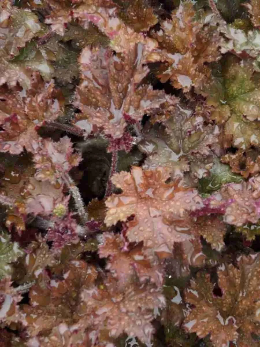 Гейхера сорта **Cappuccino** пленяет взор изысканным сочетанием оттенков и элегантностью форм. Листья её крупные, сердцевидные, рассечённые по краям, словно кружевная манжета, переливаются от золотисто-оранжевого до бронзово-красного цвета, меняющегося в зависимости от сезона и освещения. Весной листья нежно-золотистые, летом приобретают насыщенный медный оттенок, осенью же вспыхивают огненно-красными красками. Цветки гейхеры мелкие, колокольчатые, собраны в рыхлые метельчатые соцветия, возвышающиеся над листвой на стройных стеблях высотой около полуметра. Их нежный розовато-кремовый окрас дополняет палитру красок, создавая утончённый контраст с листьями. Растёт гейхера компактным кустиком, медленно разрастаясь и формируя плотную куртину, идеально подходящую для бордюров, рокариев и миксбордеров. Этот сорт отличается устойчивостью к холоду и неприхотливостью, радуя садоводов своей декоративностью круглый год.
