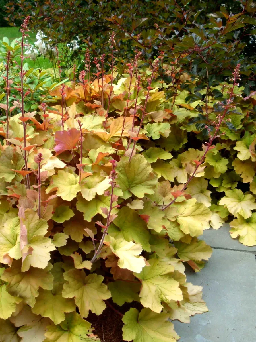 Гейхера сорта **Caramel** пленяет взор своей изысканной красотой и удивительной игрой красок. Листья её крупные, сердцевидные, рассечённые, словно кружево, переливаются оттенками от золотисто-жёлтого до медово-оранжевого, постепенно переходящими в насыщенные бронзовые тона ближе к осени. Поверхность листа бархатная, слегка морщинистая, украшена тонкими прожилками, придающими ей особую декоративную ценность. Цветоносы гейхеры возвышаются над листвой, достигая высоты около полуметра, увенчанные мелкими розовато-белыми цветами, собранными в рыхлые метельчатые соцветия. Растение предпочитает полутень и умеренно влажные почвы, прекрасно адаптируется к различным условиям произрастания, радуя садоводов своим продолжительным периодом цветения и яркой осенней палитрой.
