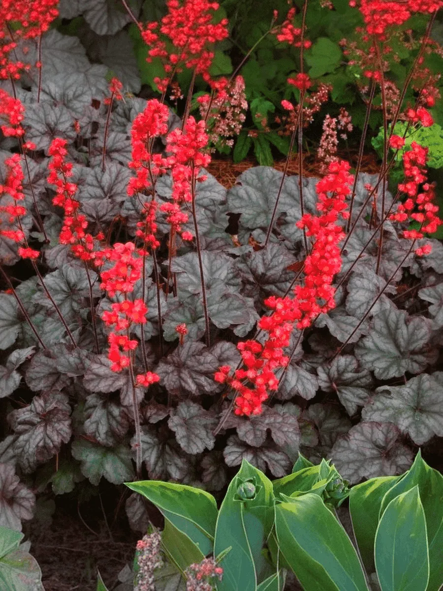 Гейхера сорта *Hollywood* пленяет взор изысканным сочетанием форм и оттенков, превращаясь в истинную жемчужину сада. Листья её крупные, сердцевидные, рассечённые по краям, словно кружевная манжета, переливаются градиентом от тёмно-красного до пурпурного цвета, оттеняя золотисто-жёлтые прожилки, придающие растению особую декоративность даже вне периода цветения. Цветоносы возвышаются над листвой стройной колонной, увенчанной мелкими белыми цветами-звёздочками, собранными в рыхлые метельчатые соцветия, привлекающие внимание своей воздушностью и лёгкостью. Растёт гейхера компактно, формируя плотный куст высотой около полуметра, предпочитая полутень и умеренно-влажные почвы, легко адаптируясь к различным условиям произрастания и радуя глаз своим великолепием долгие месяцы вплоть до первых заморозков.