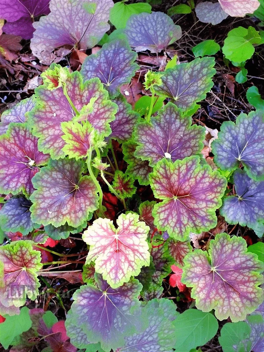 Гейхера сорта *Knock Out* пленяет взор своей изысканной декоративностью и удивительной палитрой красок. Это компактное растение высотой около 45 см образует плотную куртинку густо расположенных стеблей, увенчанных крупными листьями оригинальной формы. Листья гейхеры имеют характерную лопастную структуру, разделённую глубокими вырезами на несколько сегментов, словно искусная резьба по зелёному полотну. Их поверхность покрыта нежной бархатистостью, придающей особую глубину оттенкам. Цветовая гамма варьируется от насыщенно-зелёного до бронзово-красного оттенка, переливаясь всеми градациями медовых и золотистых тонов в зависимости от освещения и сезона.
