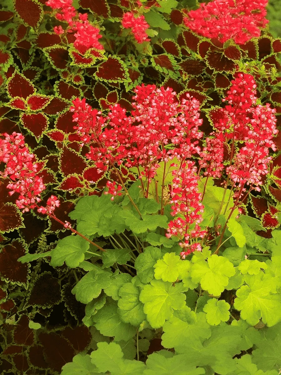 Гейхера сорта *Little Cutie Sweet Tart* пленяет взор своей миниатюрной элегантностью и нежнейшей палитрой оттенков. Это компактное растение высотой всего около 15–20 см образует плотную аккуратную розетку округлых сердцевидных листочков диаметром до 6 сантиметров. Листья украшены тонкой сетью жилок, придающих поверхности бархатность и глубину восприятия цвета. Их оттенок варьируется от нежно-розового до насыщенного кораллового, переходящего в бронзово-пурпурный ближе к осени. Цветоносы тонкие, слегка извилистые, поднимаются над листвой на высоту до 40 см, увенчанные мелкими белыми цветами-колокольчиками, собранными в рыхлые метельчатые соцветия. Период цветения длится с июня по июль, привлекая внимание насекомых-опылителей своим тонким ароматом и изысканной простотой форм. Растение предпочитает полутень и хорошо дренированные почвы, прекрасно адаптируется к условиям средней полосы России, украшая альпийские горки, рокарии и миксбордеры своими декоративными листьями и воздушными кистями цветов.