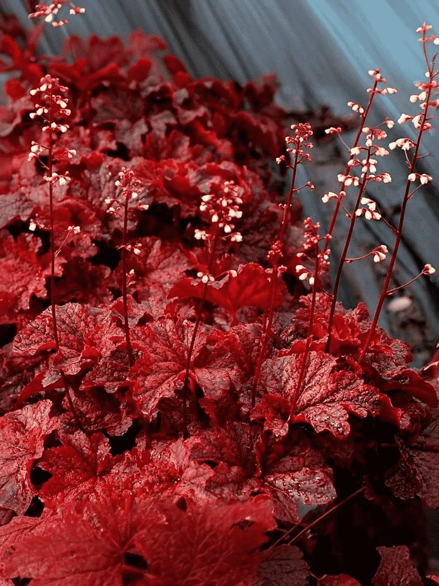 Гейхера сорта *Northern Exposure Red* пленяет взор изысканным сочетанием форм и оттенков, превращаясь в истинную жемчужину сада. Её компактная розетка состоит из плотных кожистых листьев сердцевидной формы, украшенных чётко выраженными жилками, придающими особую рельефность поверхности листовых пластин. Окраска листвы варьируется от насыщенно-красной до пурпурно-коричневой, переливаясь оттенками меди и бронзы в зависимости от освещения и сезона. Цветки гейхеры собраны в нежные метельчатые соцветия, возвышающиеся над листьями на тонких прочных стеблях высотой около полуметра. Бутоны раскрываются мелкими колокольчатыми цветами кремово-белого оттенка, источающими тонкий аромат, привлекающий насекомых-опылителей. Растение предпочитает полутень и умеренно влажные почвы, демонстрируя устойчивость к холоду и засухе, благодаря чему широко используется в ландшафтном дизайне северных регионов Европы и Северной Америки.