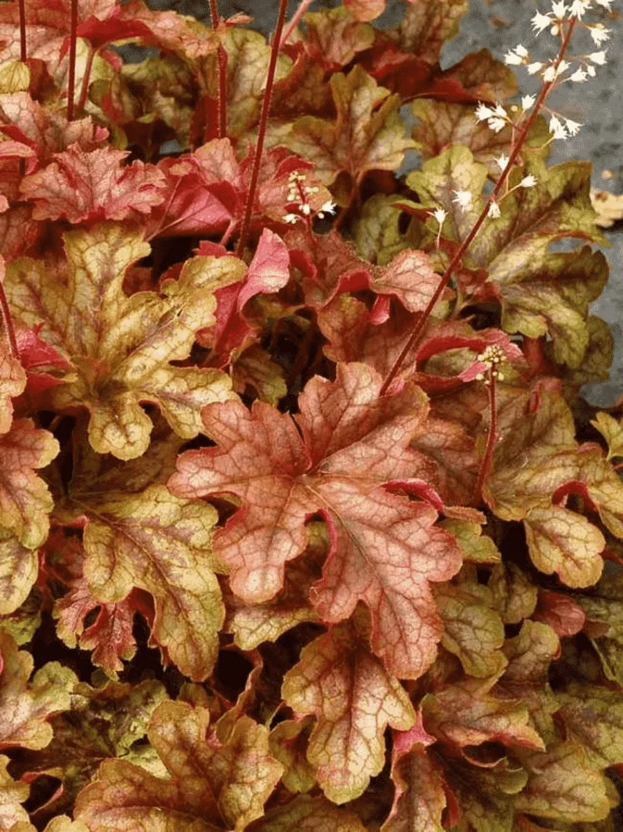Гейхерелла сорта *Autumn Cascade* пленяет взор своей изысканной декоративностью и утончённой красотой. Это компактное растение высотой около 45–60 см образует живописную куртинку из ажурных листьев, украшенных нежной сетью прожилок. Листья имеют волнистую кромку и сердцевидную форму, меняющую свою палитру от насыщенно-зелёного до бронзово-красного оттенка в зависимости от сезона. Осенью листья приобретают особенно яркие тона, словно вспыхивая огнём среди осеннего сада. Цветки гейхереллы собраны в рыхлые метельчатые соцветия нежно-розового цвета, возвышающиеся над листвой на тонких прочных стеблях. Растение предпочитает полутень и хорошо дренированные почвы, прекрасно адаптируется к различным условиям выращивания и широко используется в ландшафтном дизайне благодаря своему продолжительному периоду декоративности и неприхотливости.
