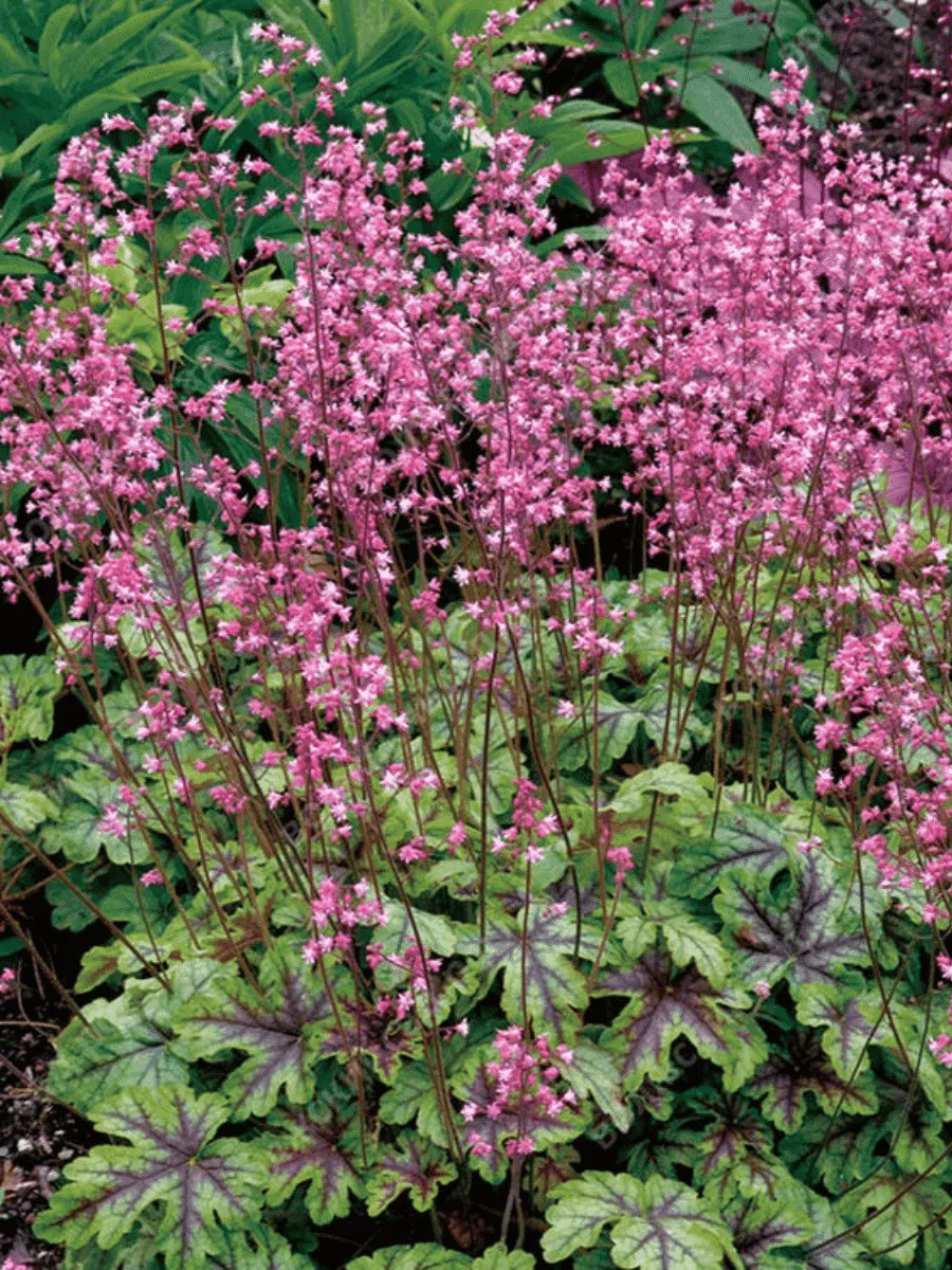 Гейхерелла сорта *Tapestry* пленяет взор своей живописной декоративностью и изысканной палитрой красок. Это многолетнее растение образует компактную розетку плотных, слегка волнистых листьев, украшенных замысловатым узором прожилок. Листья крупные, сердцевидные, бархатистые на ощупь, словно покрытые нежнейшей пудрой. Их поверхность переливается от тёмно-красного до пурпурного оттенка, переходящего в бронзово-зелёный тон ближе к краям листовых пластин. Цветовая гамма меняется в зависимости от сезона и освещения, придавая растению особую привлекательность круглый год. Весной гейхерелла покрывается мелкими соцветиями нежно-розового цвета, собранными в рыхлые метёлки над лиственной массой. Высота взрослого куста достигает примерно 45 см, ширина около 60 см. Растёт медленно, предпочитая полутень и умеренно влажные почвы, легко адаптируясь к различным условиям выращивания. Благодаря своему эффектному внешнему виду и неприхотливости гейхерелла *Tapestry* широко используется в ландшафтном дизайне, создавая яркие акценты в садах и парковых композициях.