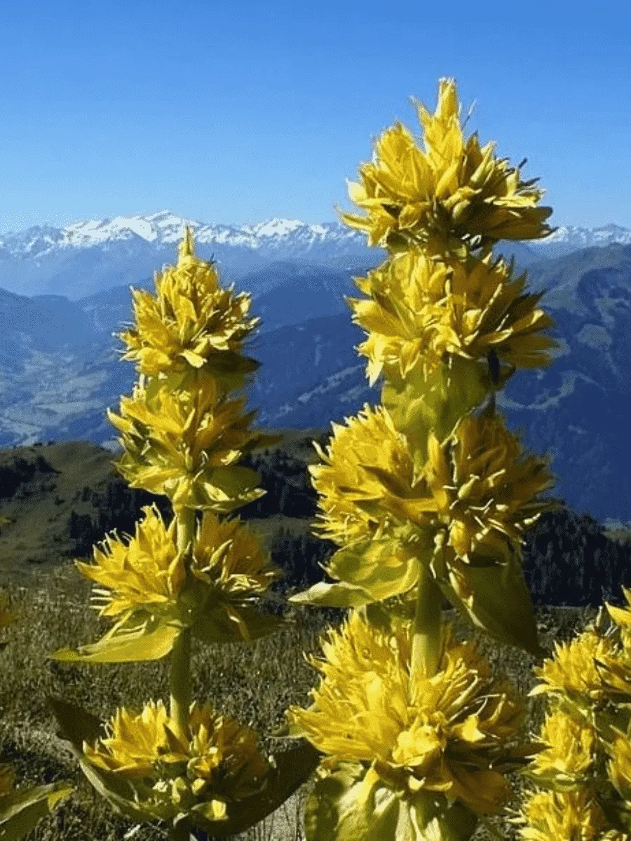 Горечавка жёлтая (лат. *Gentiana lutea*) — многолетнее травянистое растение семейства горечавковых, обладающее мощной корневой системой и достигающее высоты от одного до полутора метров. Листья крупные, супротивные, продолговато-ланцетные, тёмно-зелёные сверху и серовато-войлочные снизу, расположенные попарно вдоль стебля. Цветки собраны в верхушечные соцветия, трубчатые, ярко-жёлтые, насыщенные и глубокие оттенки которых напоминают солнечные лучи, сверкающие среди зелёных травяных волн альпийских лугов. Период цветения приходится на июль-август, когда многочисленные бутоны раскрываются один за другим, наполняя воздух тонким ароматом и привлекая насекомых-опылителей. Растёт преимущественно в высокогорьях Европы, предпочитая влажные почвы субальпийского пояса, где её мощные корни глубоко проникают в землю, обеспечивая устойчивость даже в суровых климатических условиях.