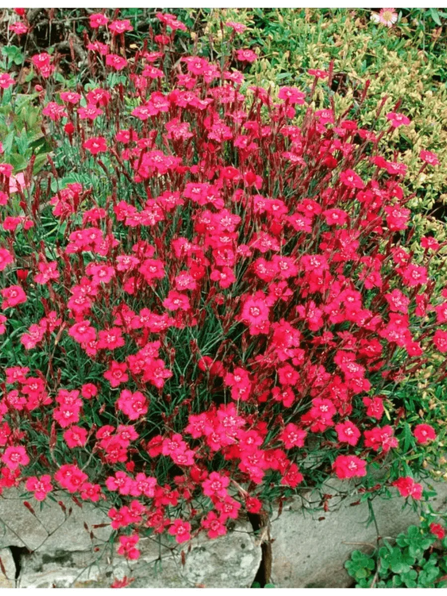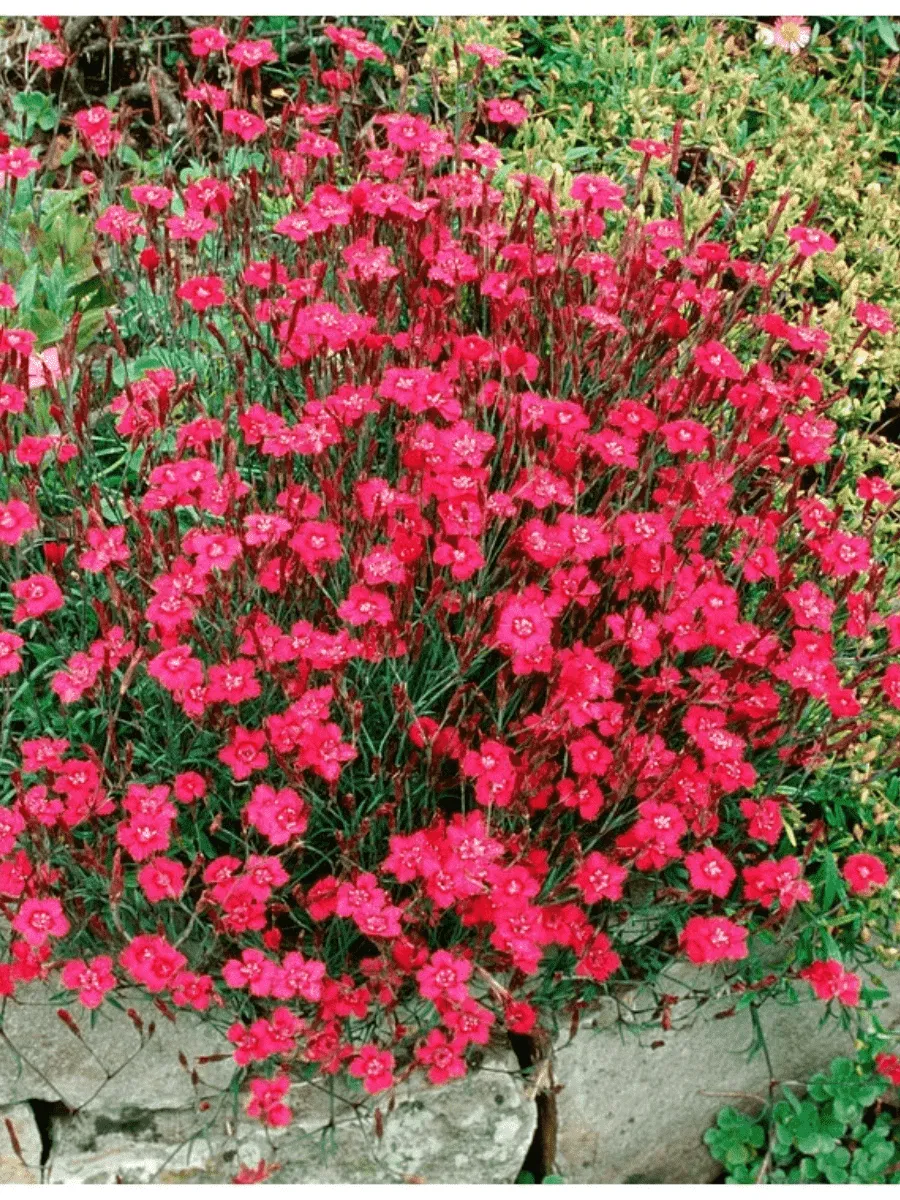 Гвоздика травянка сорта *Brilliant* пленяет взор своей утончённой красотой и нежностью форм. Это многолетнее травянистое растение образует компактную розетку изумрудно-зелёных узких листочков, слегка волнистых по краям, придающих кустику воздушность и лёгкость. Листья расположены супротивно, создавая гармоничный фон для ярких цветков. Цветки гвоздики собраны в рыхлые соцветия, возвышающиеся над листвой на тонких прочных стеблях высотой до полуметра. Лепестки цветка обладают насыщенной карминной окраской с едва заметным серебристым отливом, словно покрытые тонкой россыпью искрящихся кристаллов. Бутоны раскрываются постепенно, демонстрируя совершенство формы и грациозности линий. Период цветения продолжительный, начинается в конце весны и длится всё лето, наполняя сад тонким ароматом свежести и элегантности. Растёт быстро, легко размножается делением куста и семенами, предпочитая солнечные места и плодородные почвы, украшая собой альпийские горки, бордюры и миксбордеры.