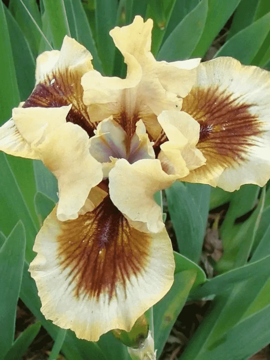 Ирис германский сорта *Zing Me* пленяет взор своей изысканной красотой и благородством форм. Высокорослое растение достигает до полутора метров высоты, украшая сад величественными вертикальными листьями насыщенно-зелёной окраски, слегка сереющей от воскового налёта. Листья линейные, длинные и узкие, словно мечи древних воинов, устремлены вверх, подчёркивая стройность облика цветка. Цветоносы мощные, несут крупные цветки диаметром около десяти сантиметров, раскрывающиеся один за другим в течение нескольких недель. Лепестки цветков обладают уникальной двухцветностью: внешние доли окрашены в глубокий фиолетово-синий оттенок с бархатистым блеском, внутренние же сияют ярким золотисто-жёлтым цветом, создавая контрастную игру оттенков. Бутоны появляются в конце весны и радуют глаз своим великолепием вплоть до начала лета. Растёт медленно, предпочитая солнечные места и плодородные почвы, легко размножается делением корневищ, постепенно формируя живописные группы, способные стать украшением любого сада.