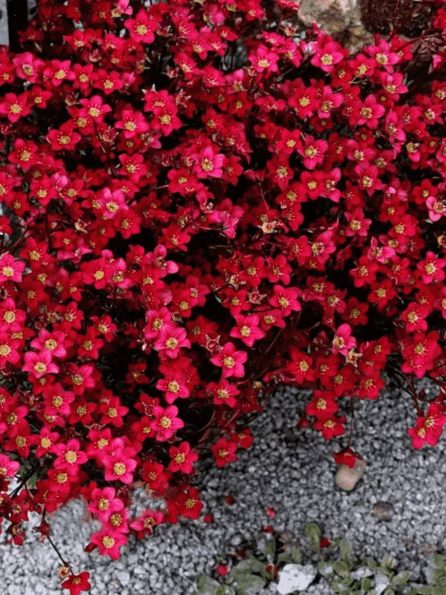 Камнеломка Арендса сорта *Saxony Red* представляет собой компактный вечнозелёный многолетник высотой до 15 см, формирующий плотную куртинку густо покрытых мелкими листьями стеблей. Листья округло-яйцевидные, кожистые, блестящие, насыщенно-зелёные летом и приобретающие яркие бронзово-красноватые оттенки осенью и зимой благодаря особому пигменту антоциану. Цветки мелкие, многочисленные, собраны в рыхлые щитковидные соцветия диаметром около 8–10 см, окрашены нежной розовато-белой гаммой с лёгким пурпурным оттенком, распускаются ранней весной, создавая эффект воздушности и легкости над плотной зелёной массой листвы. Растёт медленно, предпочитает солнечные места с хорошо дренированной почвой, устойчива к морозу и засухе, широко используется в альпинариях, рокариях и бордюрах, где её аккуратная форма и декоративность создают изысканный акцент среди камней и садовых композиций.